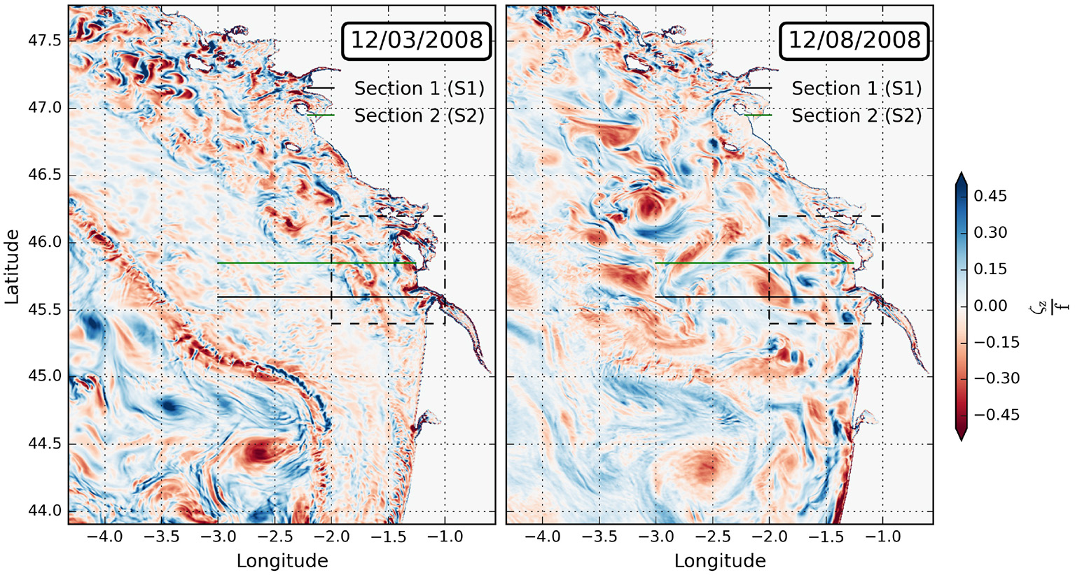Surface local Rossby number in March (left) and in August (right) 2008. The black dashed box shows the analyzed delimited region in Figures 8, 12, 15. The green and black solid lines show the vertical sections represented in Figures 9, 10.