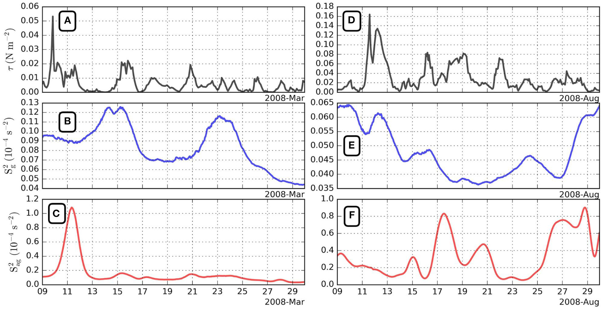 Wind stress intensity in March (A) and in August (D). Geostrophic shear in March (B) and in August (E). Ageostrophic shear in March (C) and in August (F). These quantities are averaged over the box shown in Figure 7 and between two isopycnals as explained in the text.