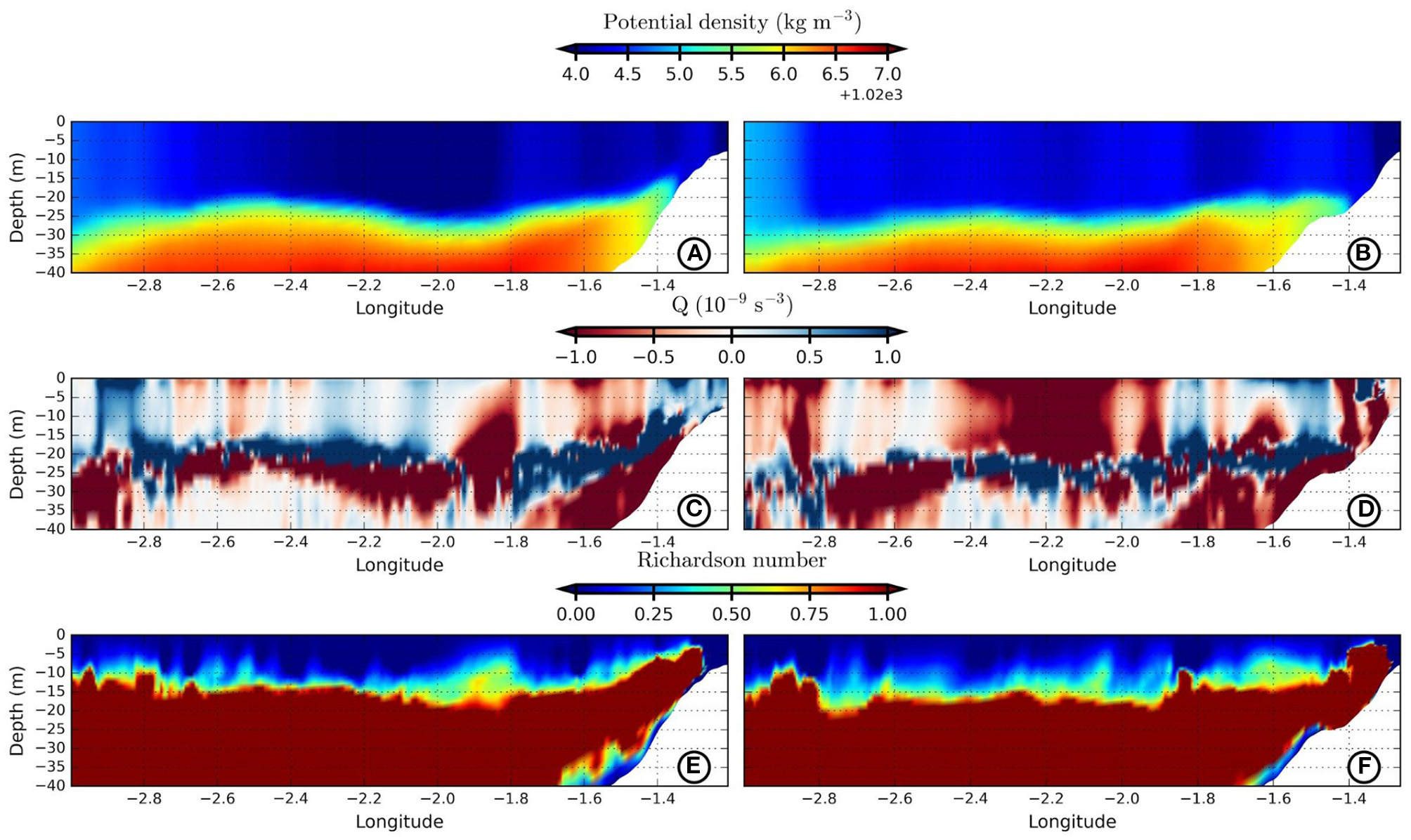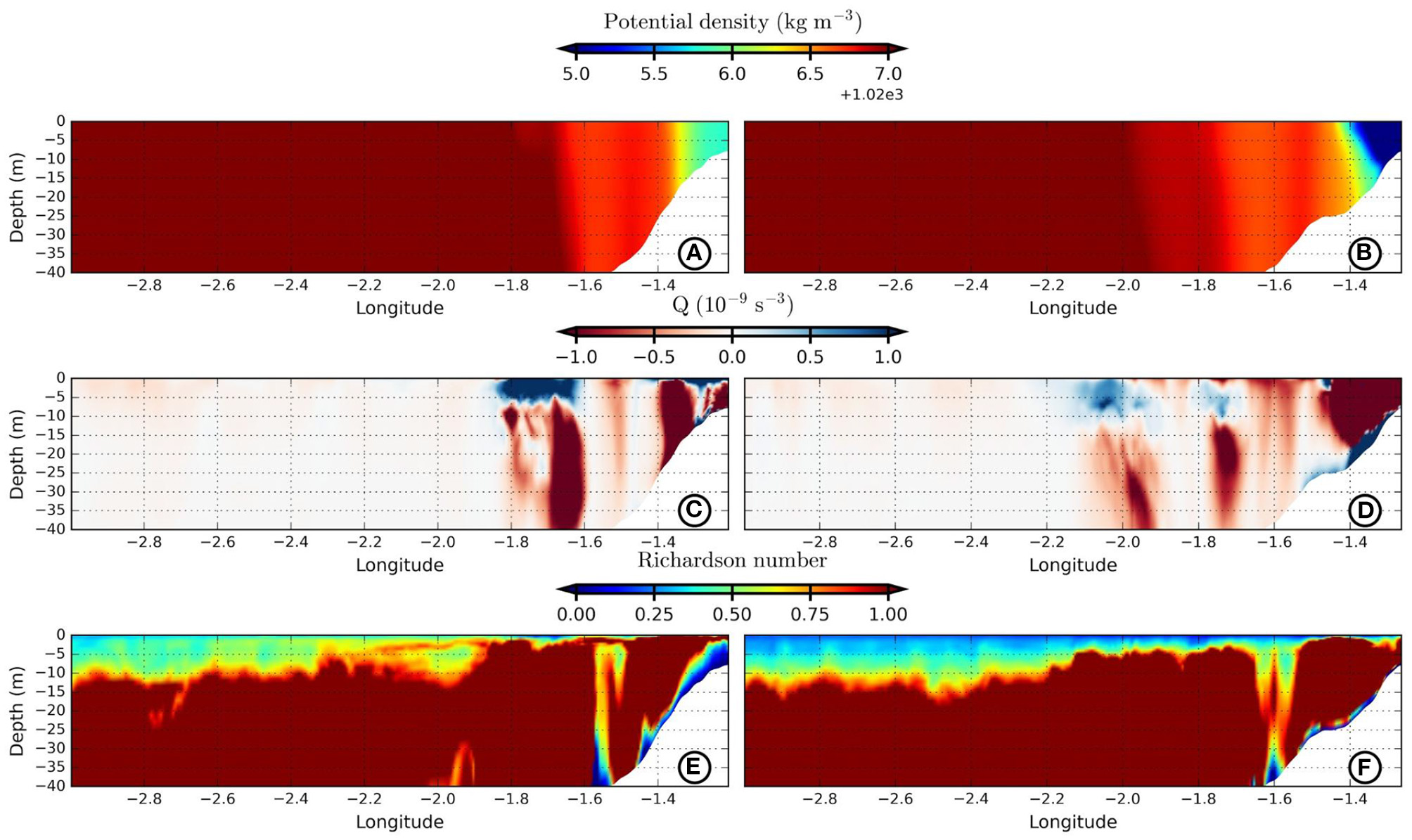 To understand the relation between river plumes, stratification and shear mixing, we evaluate the Richardson Number: