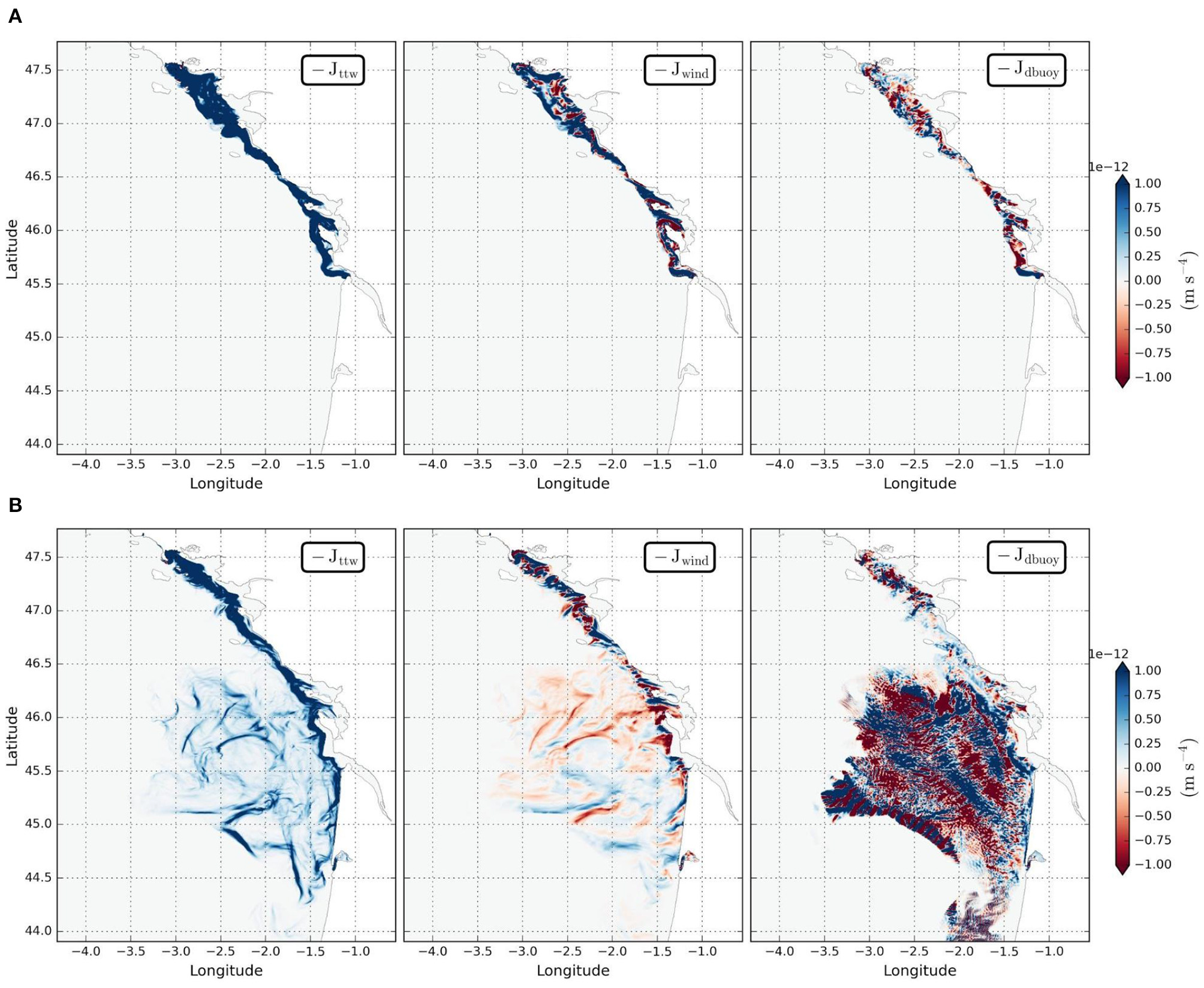The frictional term is made of the wind contribution at the surface (Jwind) and of the body force exerted by the bottom (Jbot). The diabatic term is made of the surface buoyancy flux (Jdbuoy) and of a wind-driven buoyancy flux term at fronts (Jttw, where ttw stands for turbulent thermal wind), where Ekman transport can advect dense water over light one (e.g., Thomas and Ferrari, 2008). These four terms are expressed as follows: