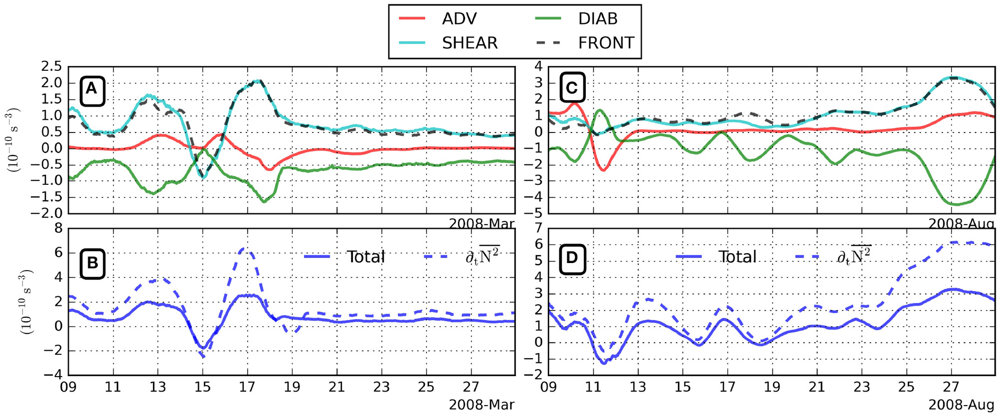 We focus on the restratification processes using a Budget of vertical density gradient (Brunt Vaisala frequency). This budget is related to PV fluxes (deduced from a volume integral of Equation 13) and frontogenesis [FRONT = ∂t(ζzb), where ζz is the vertical component of the relative vorticity and b is the buoyancy]. This budget is defined as in Wenegrat et al. (2018) but we include the lateral transport of N2 across the lateral boundaries since the computation domain is finite and subject to tides and river discharge from the estuary; it is written as: