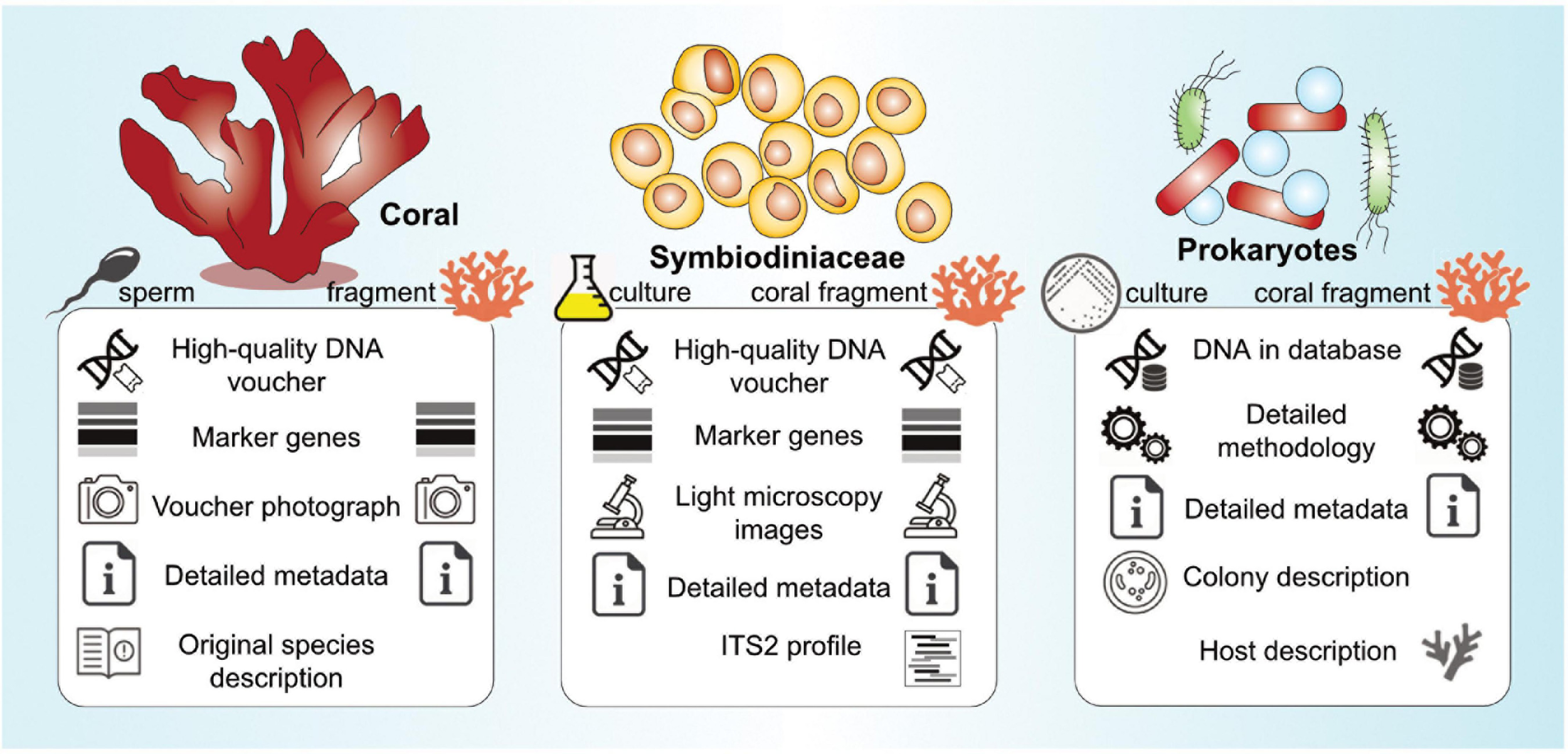 – High quality DNA voucher material from holobiont isolation – Common phylogenetic marker sequences (e.g., LSU, ITS2, cob, cp23S, psbAncr; these would only represent the numerically dominant, eco-physiologically relevant, and temporally stable primary symbiont) – Light microscopy images (for cell sizes as rough morphological feature) – Comprehensive metadata: (coral) host species, GPS location, sampling date, depth, temperature, (provisional) taxon ID – ITS2 defining intragenomic variant (DIV) profiles or denaturing gradient gel electrophoresis (DGGE) profiles of all symbionts in the host (useful for assessing community members in mixed samples and identifying the dominant species and potential contaminants, while acknowledging that without correction for ITS2 copy number they won’t necessarily reflect relative abundance accurately) |