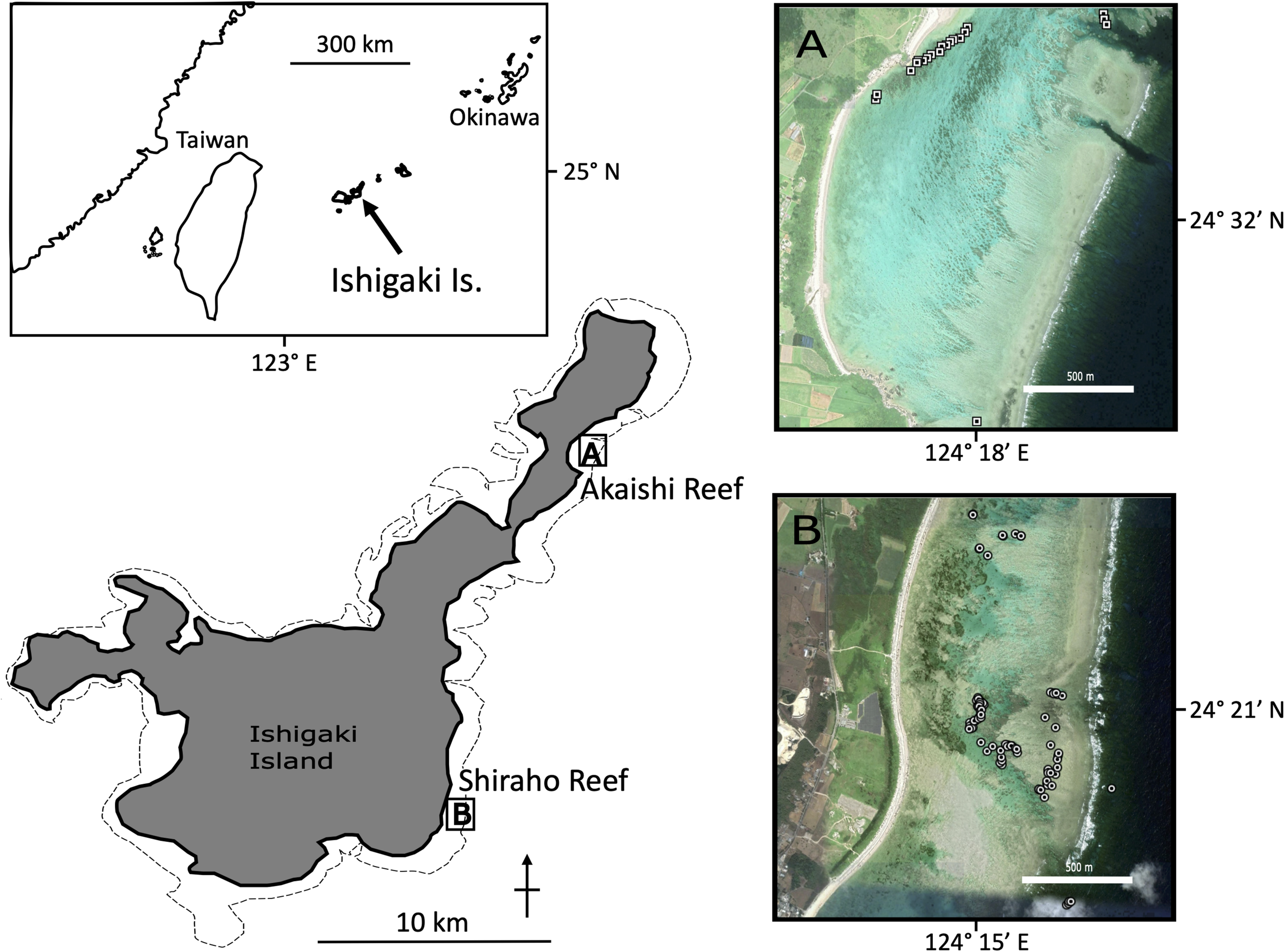 Map of sampling locations for H. coerulea. Each circles in (A) Shiraho reef and (B) Akaishi reef indicate the sampling points for individuals. The corresponding GPS coordinates can be found in Supplementary Materials.