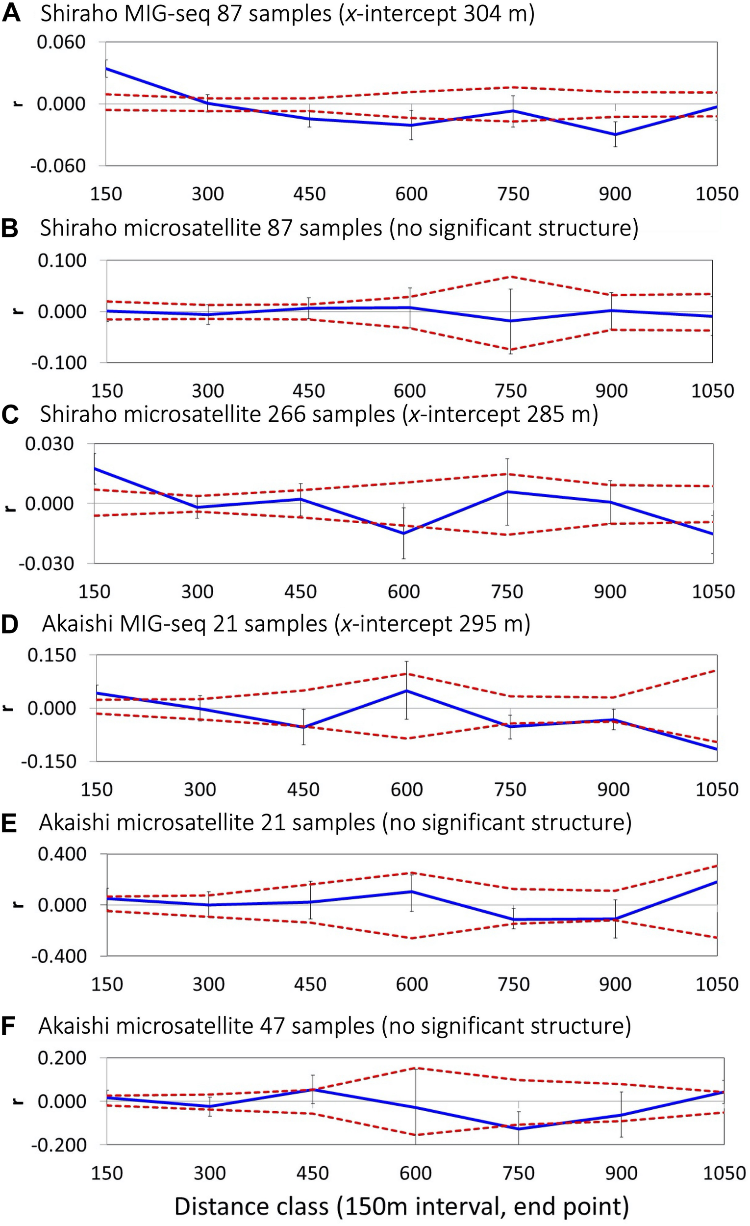 Correlograms showing the spatial correlation r as a function of distance, 95% CI about the null hypothesis of a random distribution of Heliopora coerulea, and 95% confidence error bars about r as determined by bootstrapping. Autocorrelation for the distance class size of 150 m for Shiraho reef using (A) MIG-seq data (n = 87), (B) nine microsatellite data (n = 87), (C) nine microsatellite data (n = 266) and that for Akaishi reef using (D) MIG-seq data (n = 21) and (E) nine microsatellite data (n = 21), (F) nine microsatellite data (n = 48).