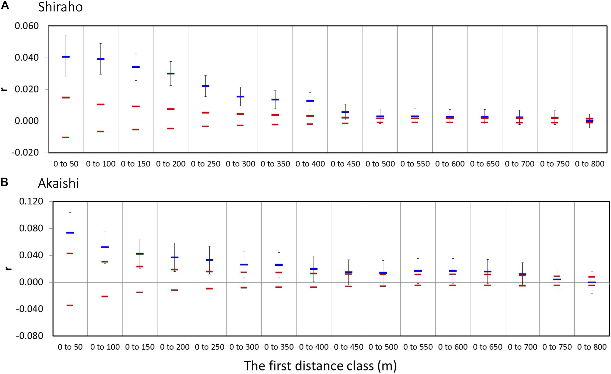 Multiple distance class plots of Heliopora coerulea showing the maximum significant first distance class size. The permuted 95% confidence intervals are also shown in red bars. (A) Shiraho reef and (B) Akaishi reef.