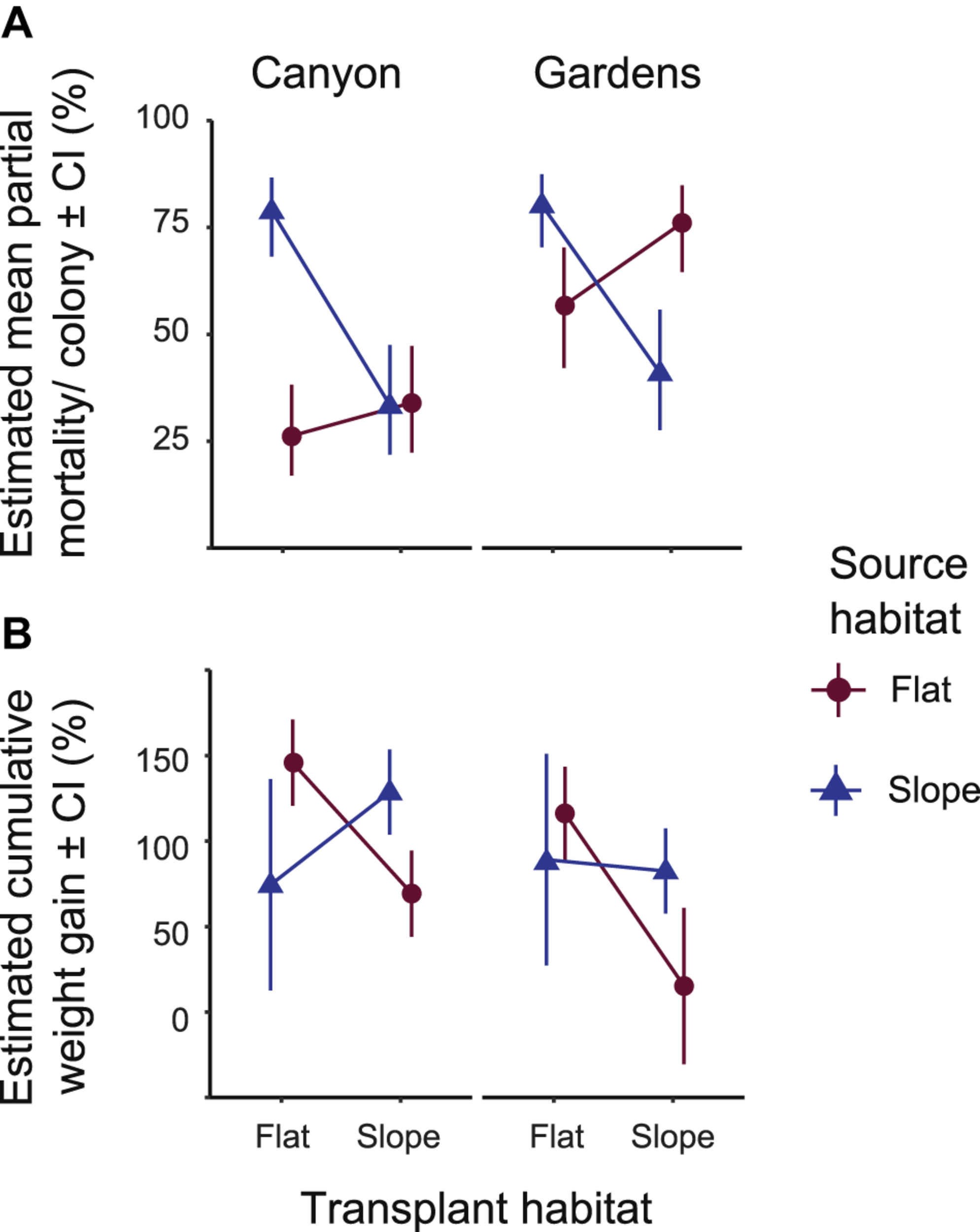 Estimated means of (A) percent partial colony mortality and (B) percent cumulative weight gain per colony after 18 months in the field (August 2013). Positive numbers designate weight gain, negative numbers designate weight loss. Error bars on both (A,B) indicate range of possible means with 95% confidence. Significance tables, Supplementary Table 4 accompanies (A) and Supplementary Table 6 accompanies (B).