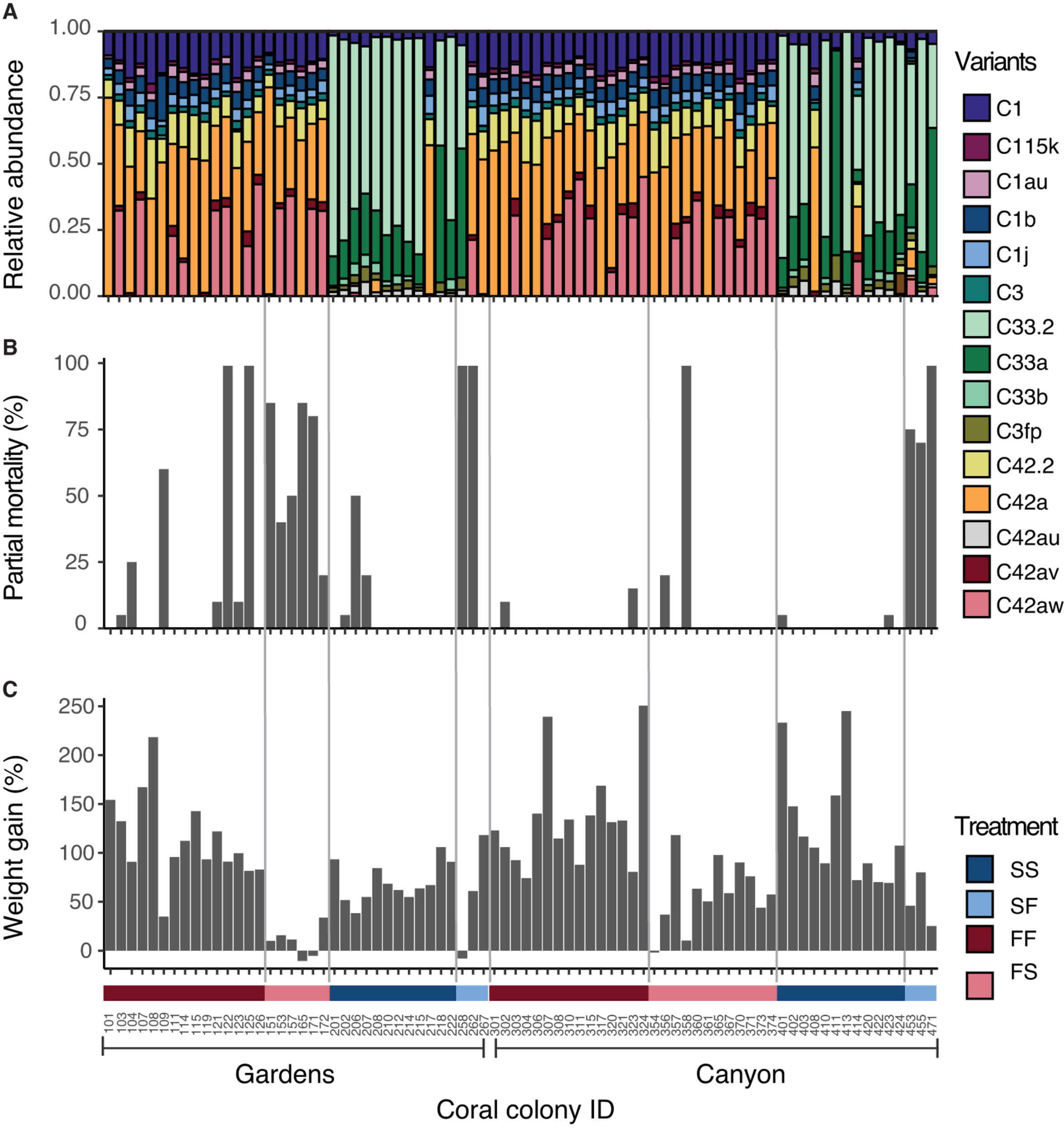Responses of individual coral colonies organized by site and treatment group after 12 months of reciprocal transplantation (March 2013). Numbers on the X-axis are colony ID and each ID number may correspond with a matching genet in the opposite habitat (i.e., FF ID 101 matches FS ID 151). All matching genetic pairs are listed in Supplementary Table 16. (A) Symbiodiniaceae community in coral tissue. Each color denotes relative abundance of different ITS2 sequence variants present. (B) Percent partial colony mortality. (C) Percent cumulative weight gain. Positive numbers designate weight gain, negative numbers designate weight loss.