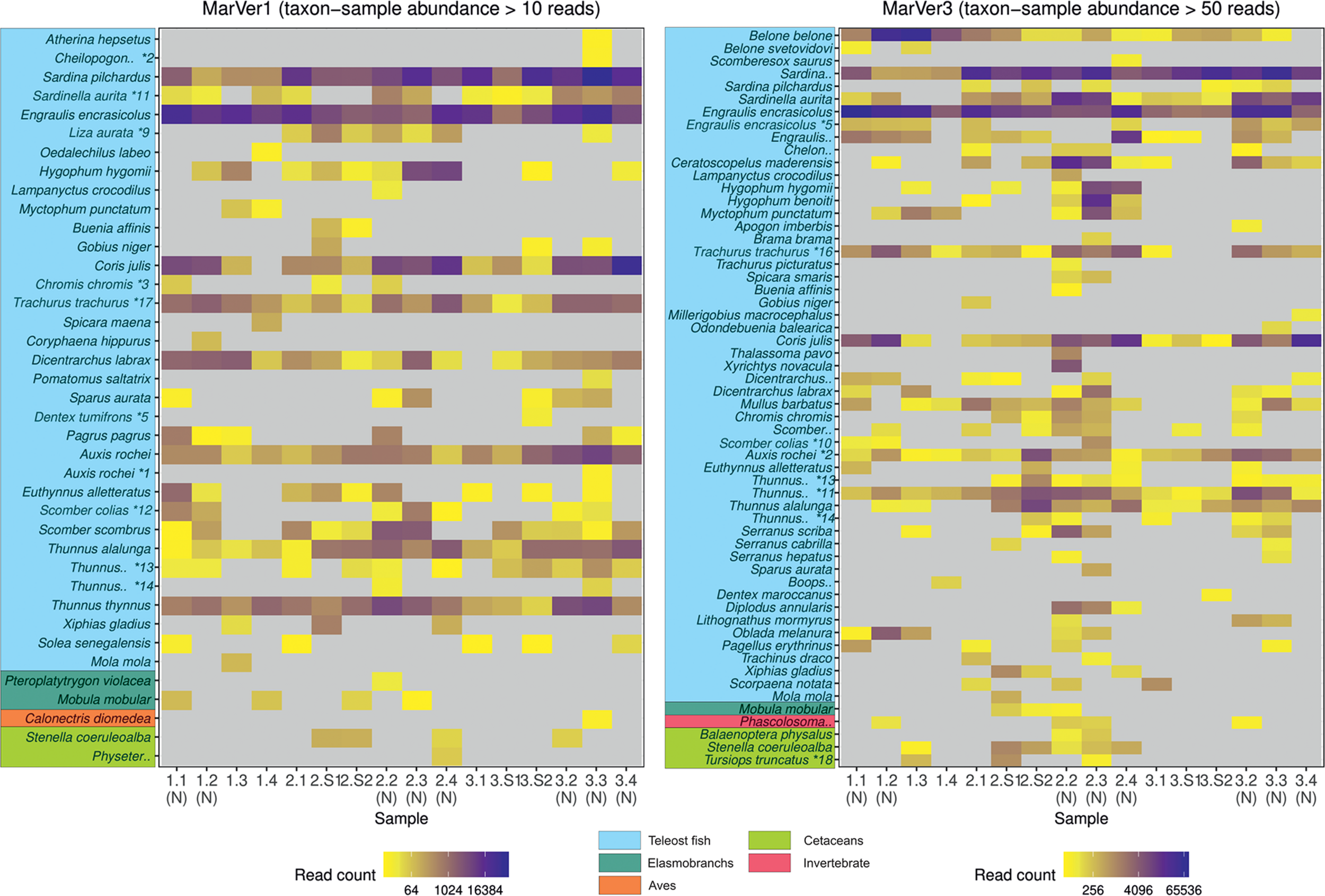 A heatmap of MOTU read counts in each sample recovered for the MarVer1 and MarVer3 loci. MOTU abundance is indicated by the color scale. Rare MOTU occurrences with taxon-sample abundances less than 10 and 50 reads respectively were excluded from the figure to improve readability. (N), night-time sample; (S), cetacean sighting sample. MOTUs annotations with “*” were adjusted as described in Supplementary Table 3. Full MOTU counts are given in Supplementary Tables 4, 5.