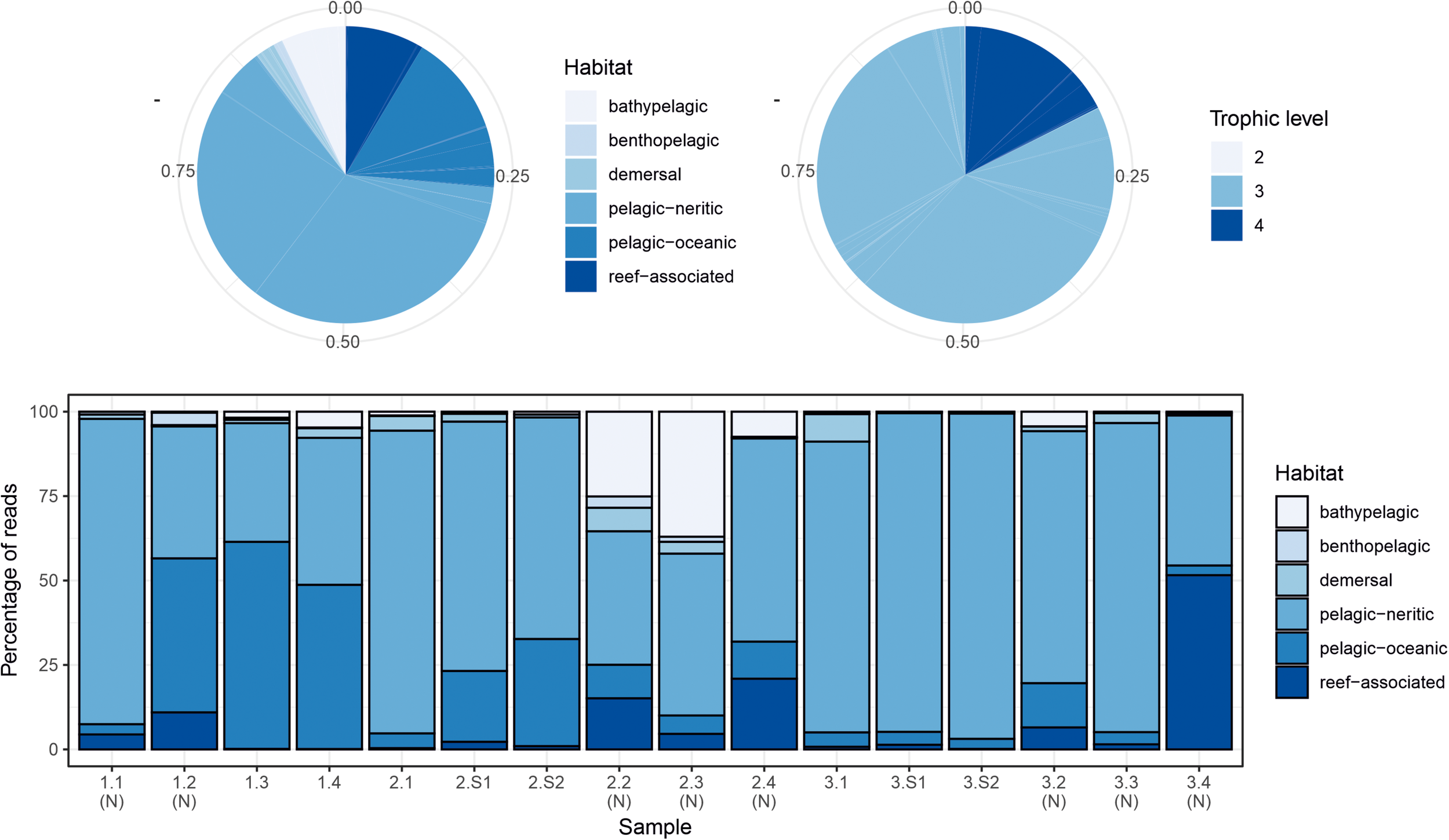 Summary of proportions of species habitat types and trophic levels for MarVer3 MOTUs, for the overall sample (pie charts), and individual samples (barchart). (N), night-time sample; (S), cetacean sighting sample. Species habitat type and trophic level definitions taken from www.fishbase.se.