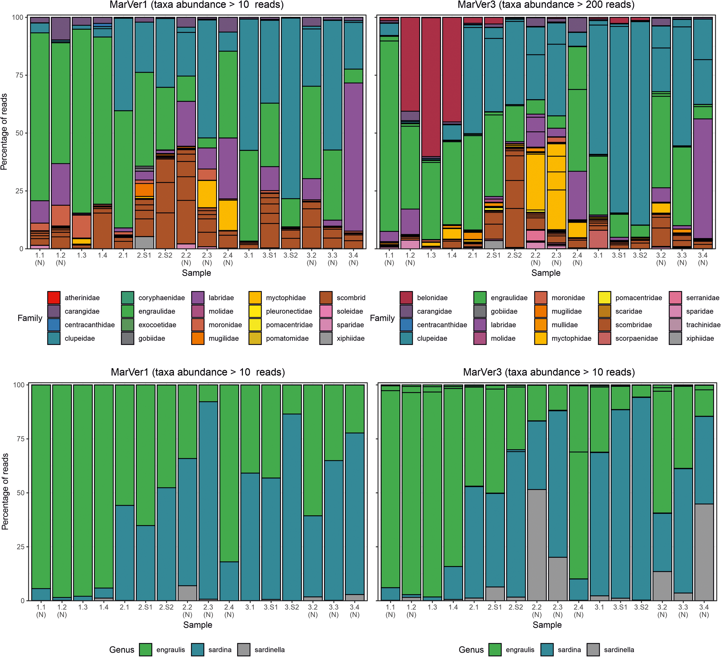 Barcharts showing proportions of the 20 most abundant teleost fish families (upper), and anchovy and sardine/sardinella genus MOTUs in each sample for MarVer1 and MarVer3. (N), night-time sample; (S), cetacean sighting sample.