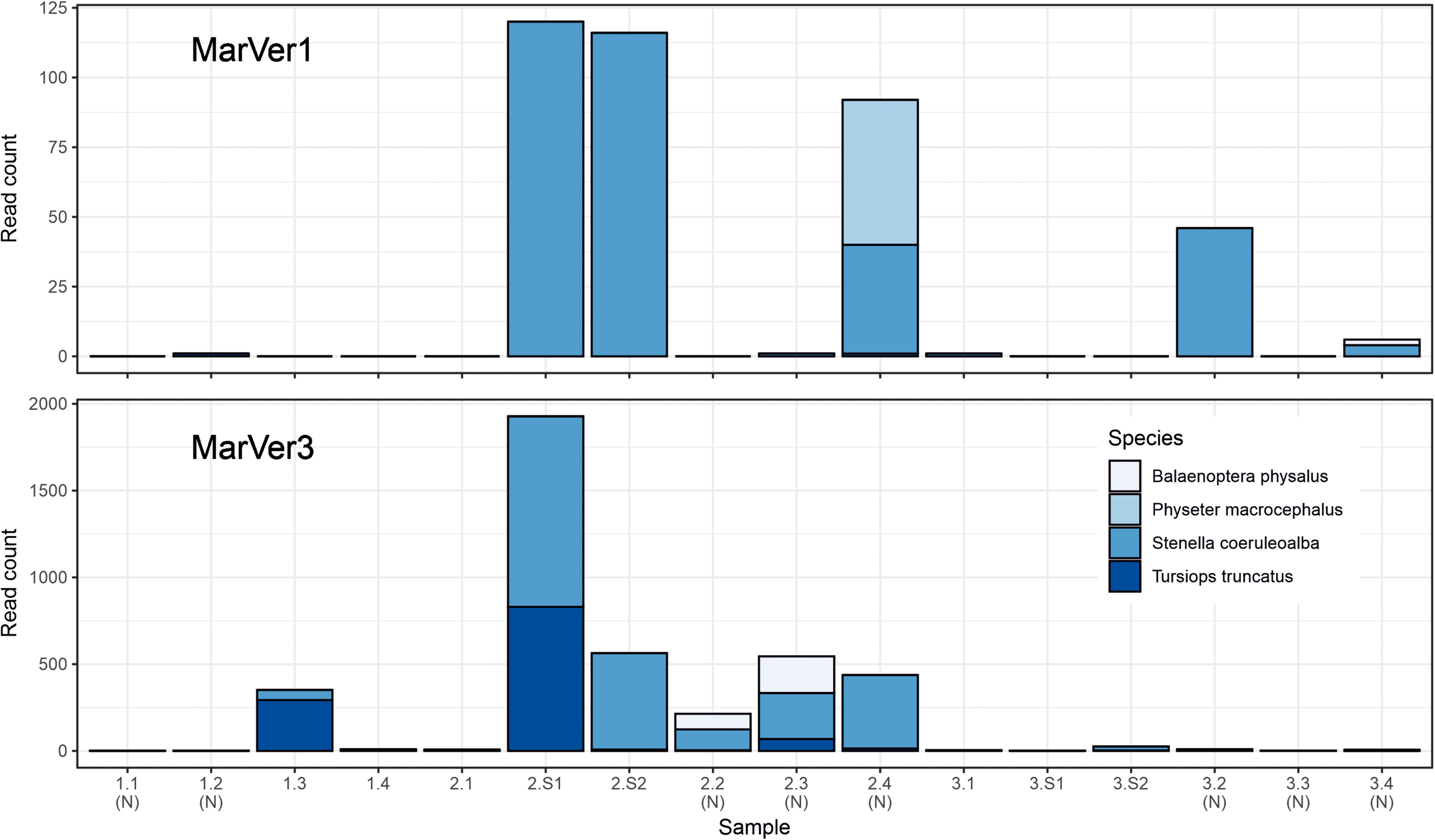 Barcharts showing read counts for cetacean MOTUs in each sample for MarVer1 and MarVer3. (N), night-time sample; (S), cetacean sighting sample.