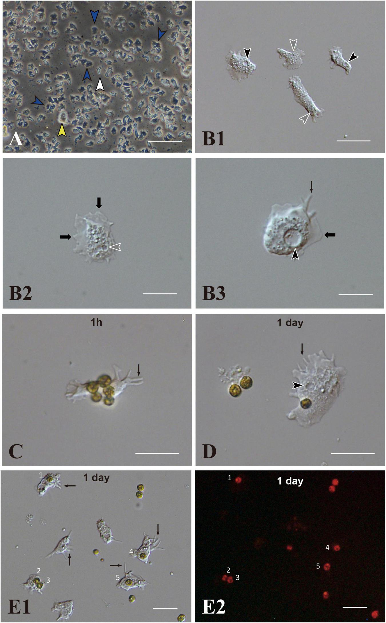 Acropora tenuis cells of the IVB5 line and symbiosis with the photosynthetic dinoflagellate, Breviolum minutum. (A) A vertical microscope image of IVB5 line. Most cells are dark, flattened, amorphous cells (blue arrowheads), while a few brilliant cells (yellow arrowhead) and small cells of different morphology (white arrowhead) are present as well. (B–D) Differential interference microscopy images showing morphological features of flattened, amorphous cells. (B1) Lower and (B2,B3) higher magnification. Flattened amorphous cells contain a large vacuole (black arrowheads) and several small vesicles (white arrowheads) in the cytoplasm. They extend lamellipodia (bold b black arrows) and/or filopodia (thin black arrows) and show locomotor activity. (C–E) Coral cell engulfment of dinoflagellates, (C) 1 h (1 h) and (D,E) 1 day after mixturing cells of the two taxa. (E2) is a dark-field image of (E1), showing red auto-fluorescence of dinoflagellates. Cells endocytosed dinoflagellates numbered 1–5. Filopodia are indicated by arrows and vacuoles by black arrowheads. Scale bars, 100 μm in (A), 50 μm in (B1), 20 μm in (B2,B3,C,D), and 50 μm in (E1,E2).