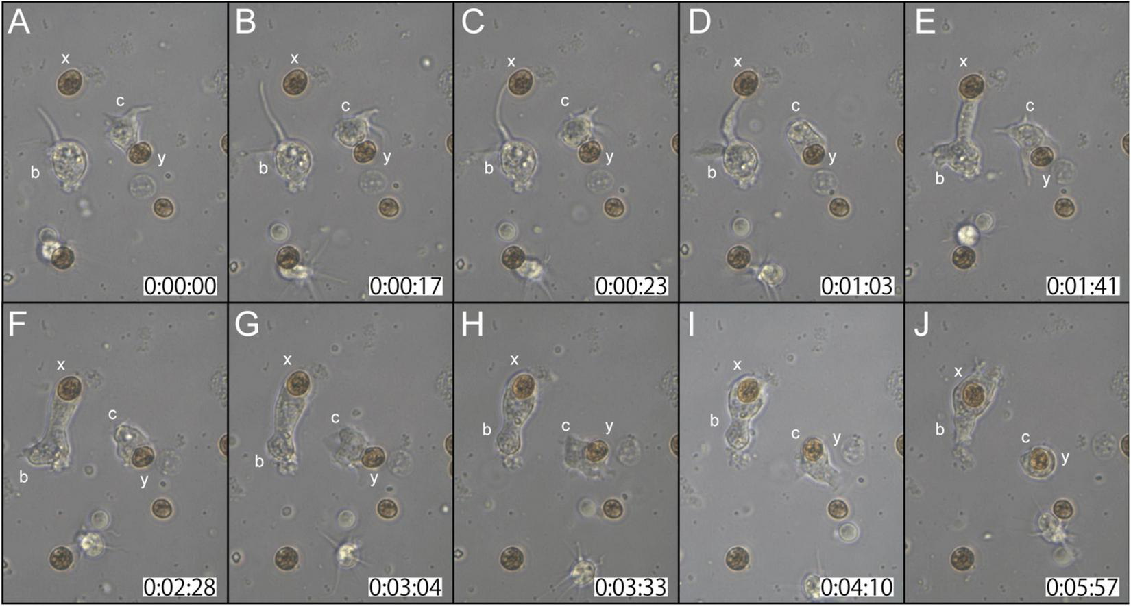 Two examples of in vitro symbiosis are described below. In the first case (Supplementary Movie 2), three coral cells and four dinoflagellates are present in the frames (Figure 2A). At 0:00:00 (starting time of observation, Figure 2A), coral cell b extended a filopodium further and further (Figure 2B), and after approximately 20 sec, the filopodium contacted dinoflagellate x (Figure 2C). Maintaining contact with dinoflagellate x, the filopodium of cell b became thicker and thicker (Figures 2C–E), and ∼2 min after contact, dinoflagellate x was phagocytosed by the thickened filopodium or a part of the cytoplasm of cell b (Figure 2F). Dinoflagellate x was moved to the center of cell b (from Figures 2F–J). Cell b still extended lamellipodia and showed active locomotion. The accomplishment of in vitro symbiosis between b and x, from contact of the two cells until the settlement of x in the cytoplasm of b, took only five min. In addition, during this time, cell c contacted dinoflagellate y with its cell membrane or a thin lamellipodium (Figure 2A). Cell c actively shifted the membrane around y (Figures 2A–C) and quickly incorporated y into the cytoplasm (Figure 2D). With symbiotic dinoflagellate y in the cytoplasm, cell c exhibited locomotion using pseudopodia (Figures 2E–J). Cell c also promptly engulfed dinoflagellate y within a few min after their first encounter.