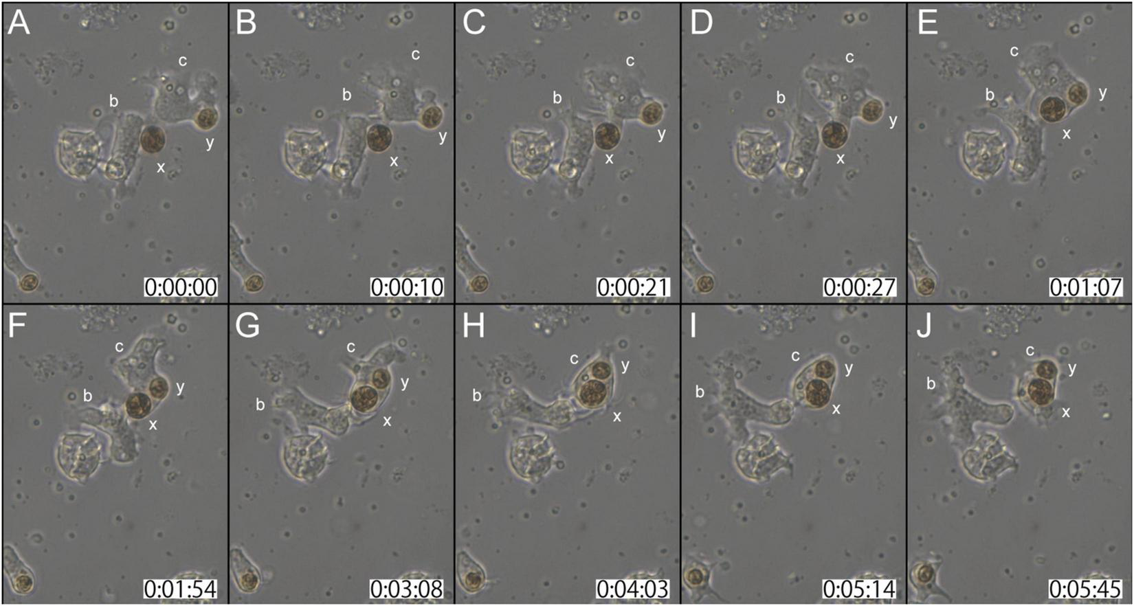 Another time-lapse video of symbiotic interactions of coral cells (b and c) and dinoflagellates (x and y). The starting point of observations is shown at 0 h: 00 min: 00 s. (A–J) Serial pictures are taken at time intervals indicated at the bottom. Coral cell b interacted with symbiont x, but did not incorporate it, whereas coral cell c endocytosed both x and y. See the detailed description in the text.