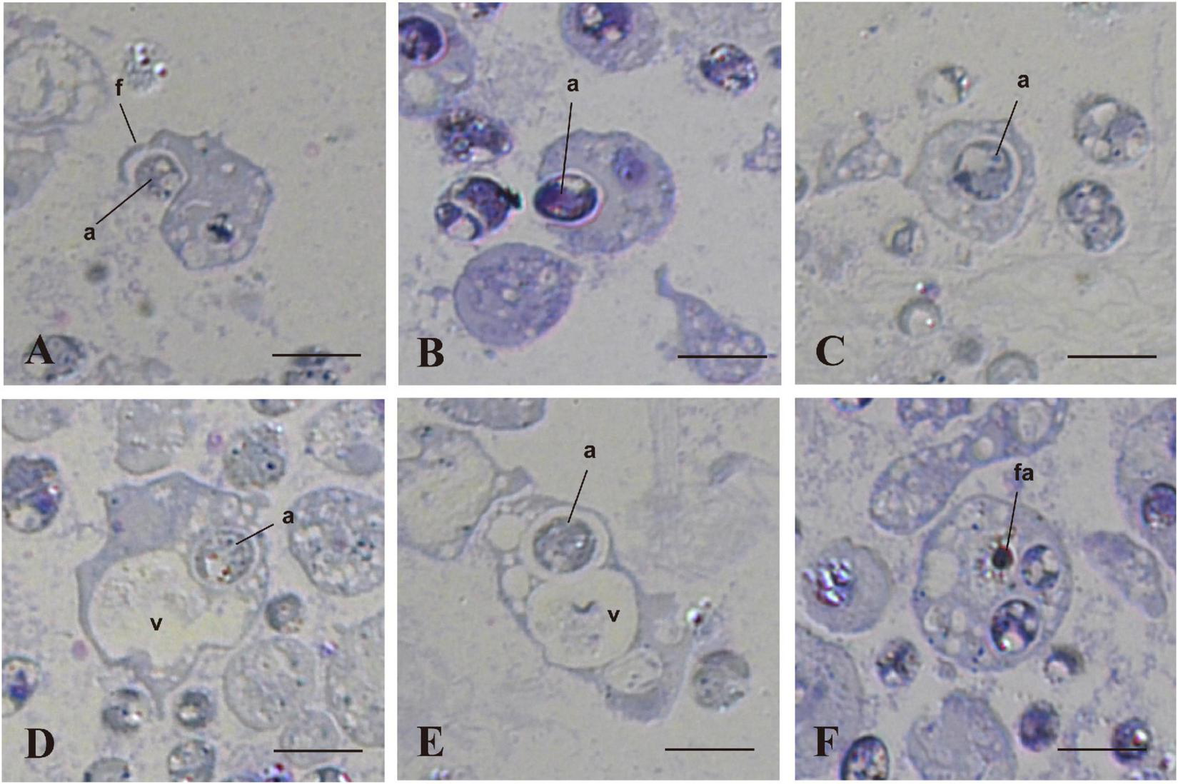 In vitro interactions between coral cells and algae, 7 h after coral cell-algae mixture. Semi-thin sections were stained with toluidine blue. (A) Coral cell extending filopodium over an alga. (B) Coral cell engulfing an alga. (C) Alga incorporated into coral cell cytoplasm. (D) Algal phagosome in association with a coral cell vacuole. (E) Algal phagosome fused with a host vacuole. (F) Fragmented alga in a coral cell. a, algae; f, filopodium; fa, fragmented alga; v, vacuole. Bars, 10 μm.