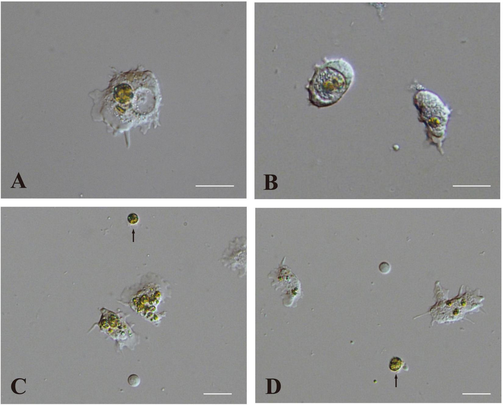 Two modes of interaction between coral cells and dinoflagellates. (A,B) Settlement of dinoflagellates in coral cell cytoplasm, (A) outside and (B) inside a vacuole. (C,D) Fragmentation followed by collapse of dinoflagellates in coral cell cytoplasm. Fragmentation appears more severe in (C) than (D). Dinoflagellates not engulfed by coral cells are indicated with arrows. Scale bar, 20 μm.