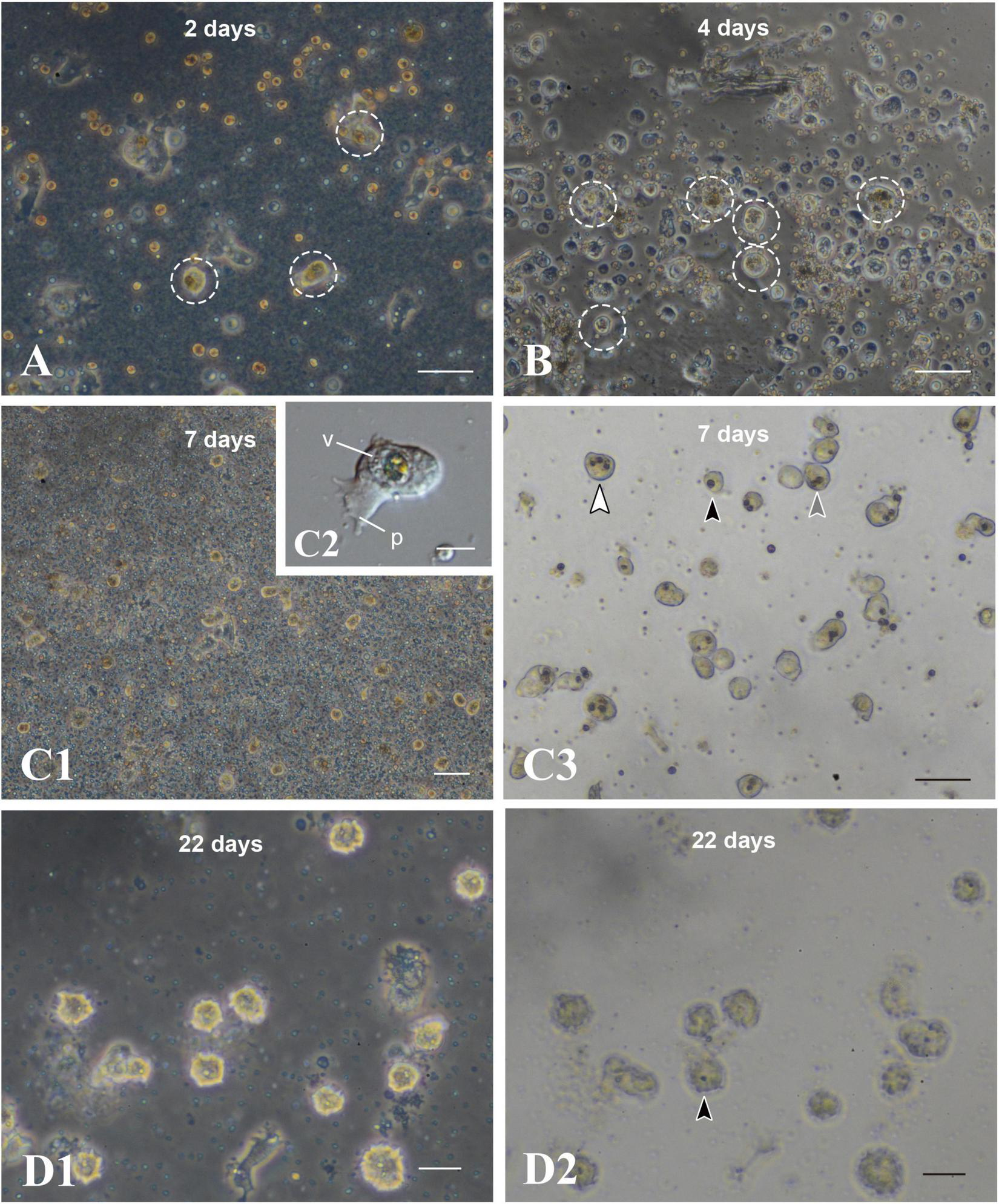Maintenance of coral cells with symbiotic dinoflagellates. (A) 2 days, (B) 4 days, (C) 7 days, and (D) 22 days after mixture of the two types of cells. Coral cells with symbiotic dinoflagellates (broken circles) became spherical, without pseudopodial extensions, and exhibit less and less locomotor activity. Those cells became globular, bright cells. (C3,D2) are bright field images of (C1,D1), showing one (black arrowhead), two (gray arrowhead), and three algae (white arrowhead) in single cells. p, pseudopodium; v, vacuole. Scale bars, 50 μm in (A,B,C3), 100 μm in (C1), 10 μm in (C2), and 20 μm in (D1,D2).