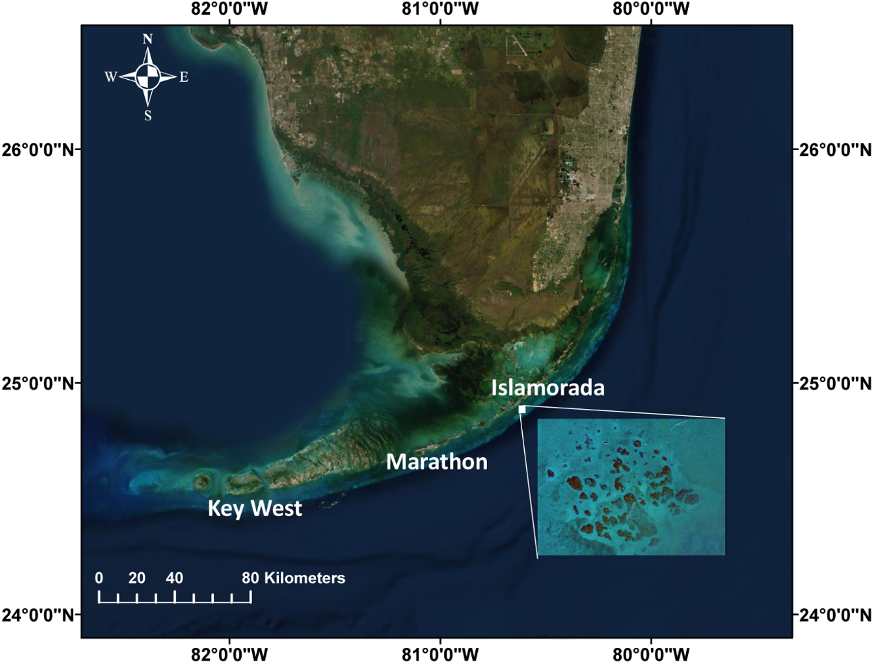 Figure 1. Florida Keys (created using ArcMap) and inserted satellite imagery obtained from Google Earth showing Cheeca Rocks.