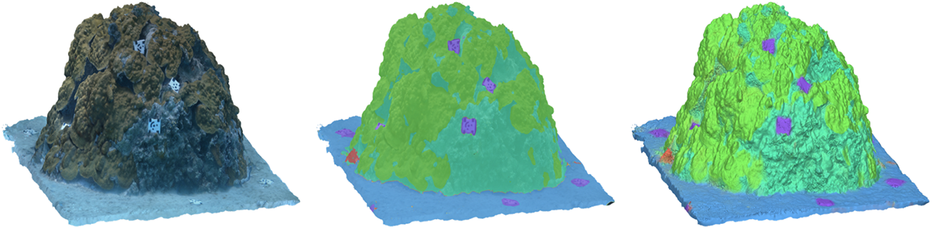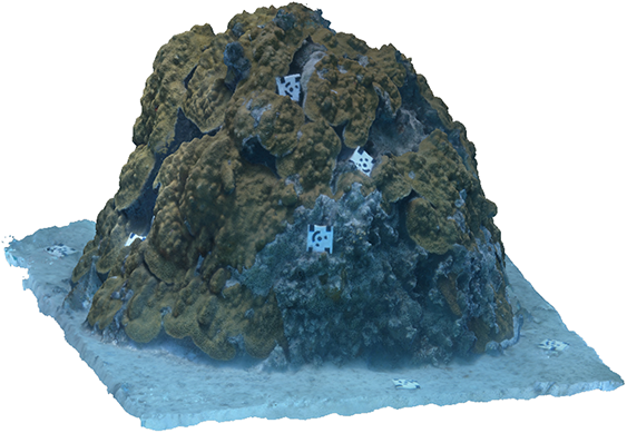 Figure 2. A textured mesh representing the example coral patch—which is roughly 1.5 m in diameter and 3 m in height—was reconstructed from still images extracted from video footage using Agisoft Metashape SfM photogrammetry software. The mesh consisted of 10 million faces and had an estimated accumulative error of 1.4 mm after providing absolute scale using the actual dimensions of the coded targets.