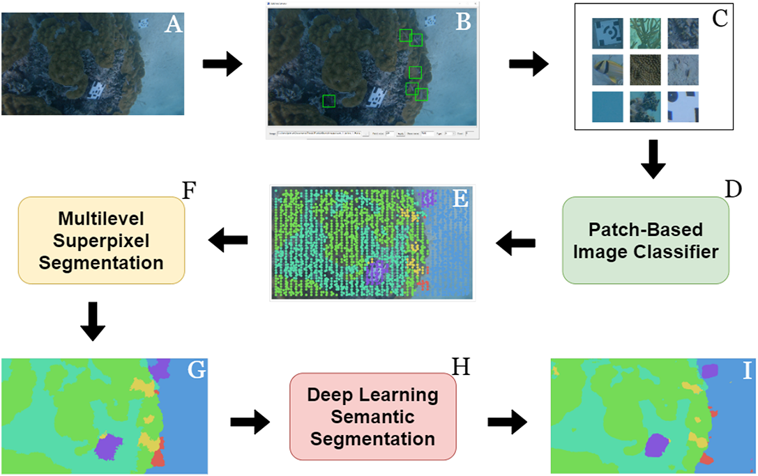 Figure 3. A diagram illustrating the workflow used to obtain dense labels for each image. Still images were extracted from the video footage (A) and imported into Rzhanov’s patch-extraction tool (B) where patches for each class category of interest were extracted (C). These patches and their corresponding labels were used to train a patch-based image classifier (D) that then provided numerous sparse labels to each image in the dataset (E). Using Fast-MSS (F), the sparse labels were converted into dense (G) and used as the pixel-wise labels necessary for training a deep learning semantic segmentation algorithm. (H) With a trained FCN, novel images collected from the same or similar habitats could then be provided with dense labels automatically (I) and without having to perform any of the previous steps (B–G).