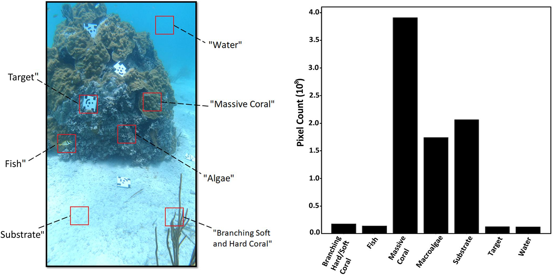 These seven class categories could be found in the still images, but only “Branching Soft and Hard Coral,”, “Massive Coral,” “Algae,” “Substrate,” and “Target” were included in the 3-D model because SfM photogrammetry is only capable of reconstructing objects that are static within the source images. Thus “Fish” and “Water” were excluded from the model.