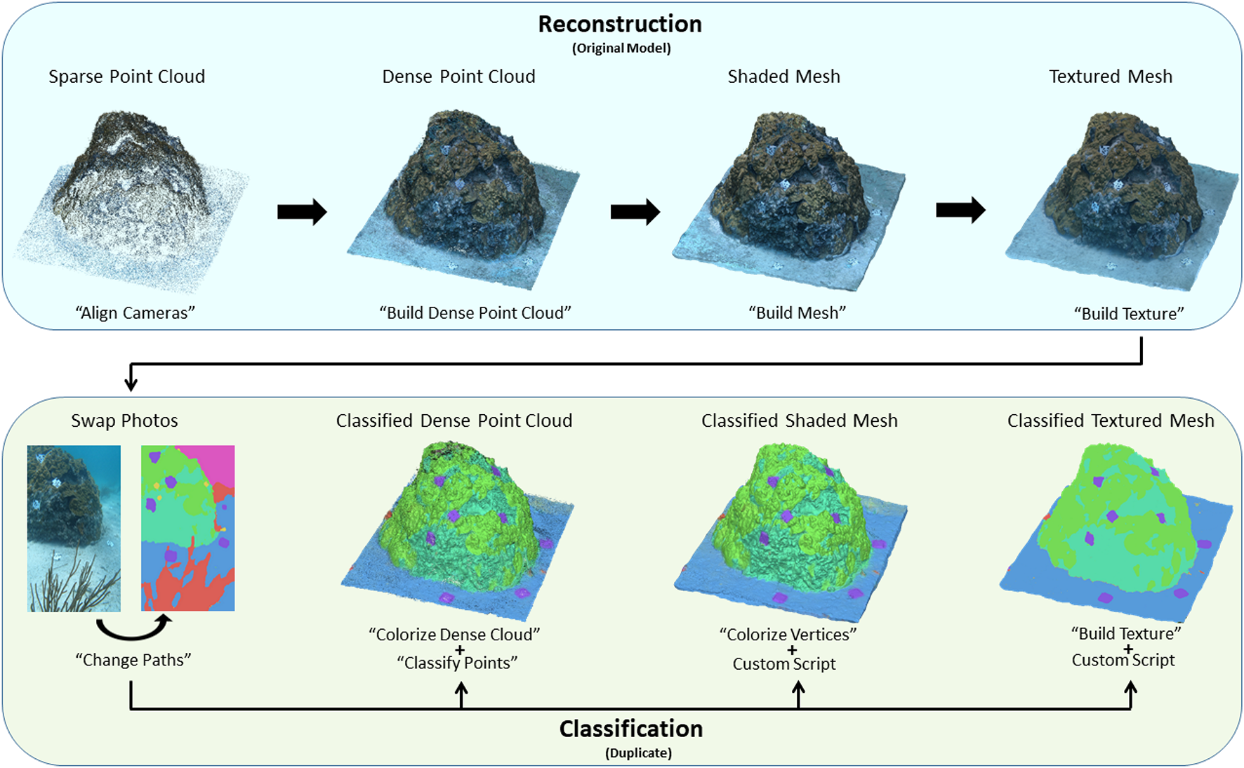 Figure 5. A diagram showing step-by-step which tools in Agisoft Metashape were used to reconstruct the 3-D model, followed by how semantic labels were provided to it. Once the source images are swapped with their corresponding dense labels, the classified point cloud, shaded mesh, and textured mesh can be created independently of one another and is not a sequential process like the reconstruction.