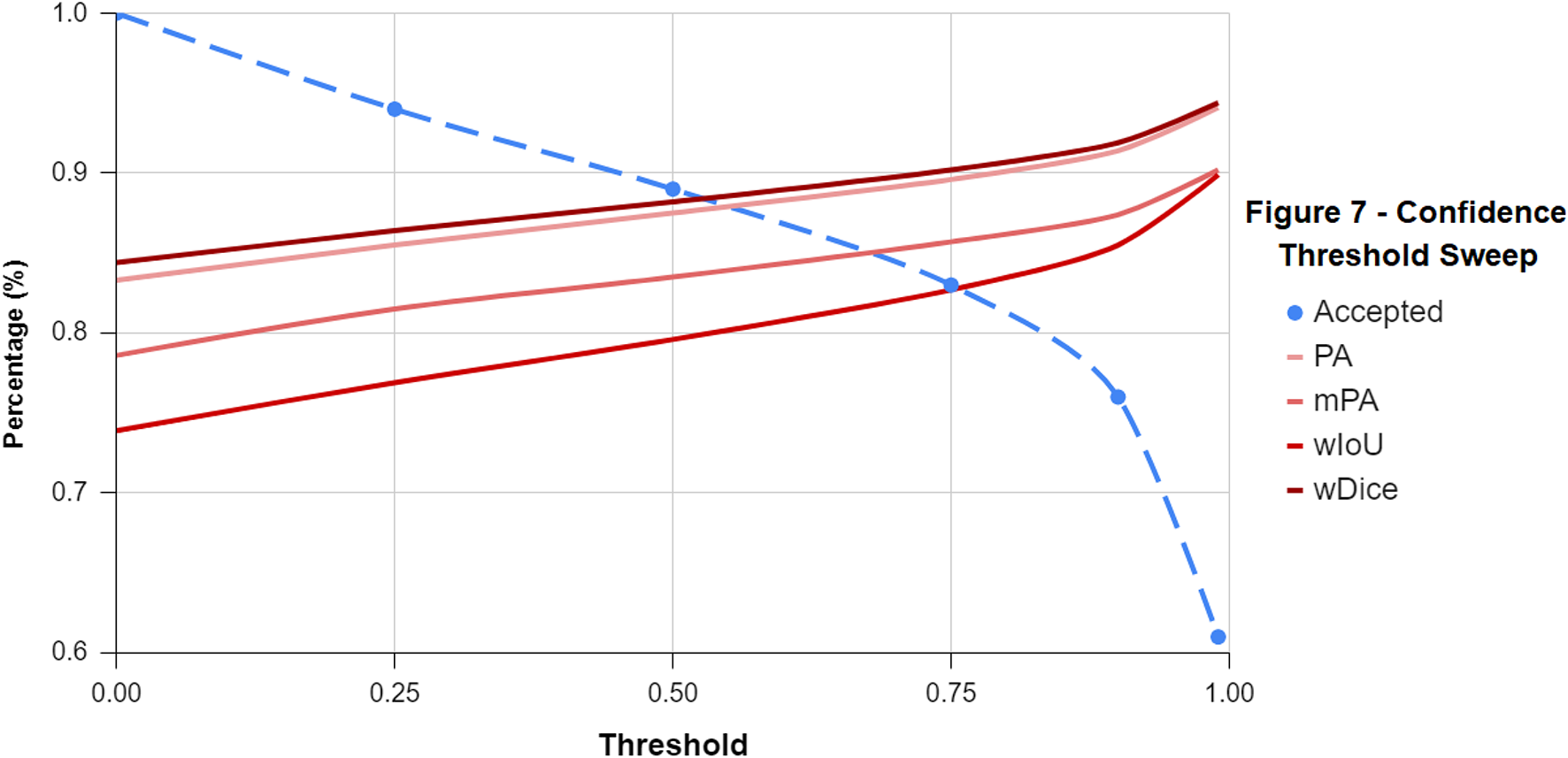 First, we present the results of how the CNN patch-based image classifier’s performance changed as a function of the confidence threshold value used. The confidence score was used to filter sparse labels that were more likely to have been misclassified.