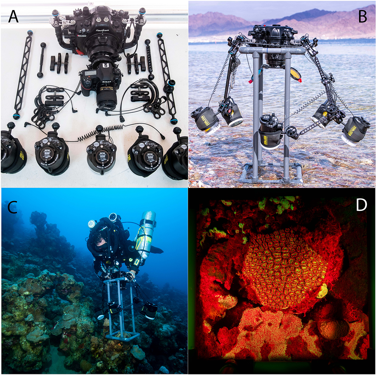 (A) Complete gear set of Nauticam housing, Nikon D850 camera with 35 mm lens, strobes and arms before assembly. (B) The complete set assembled on the quadrat before diving. (C) A diver equipped with closed circuit rebreather and the speed-FlorIS at 45 m in Bermuda. (D) An example of stony coral’s image taken in Bermuda at daytime at 45 m with the fluorescence excitation strobe without subtraction.