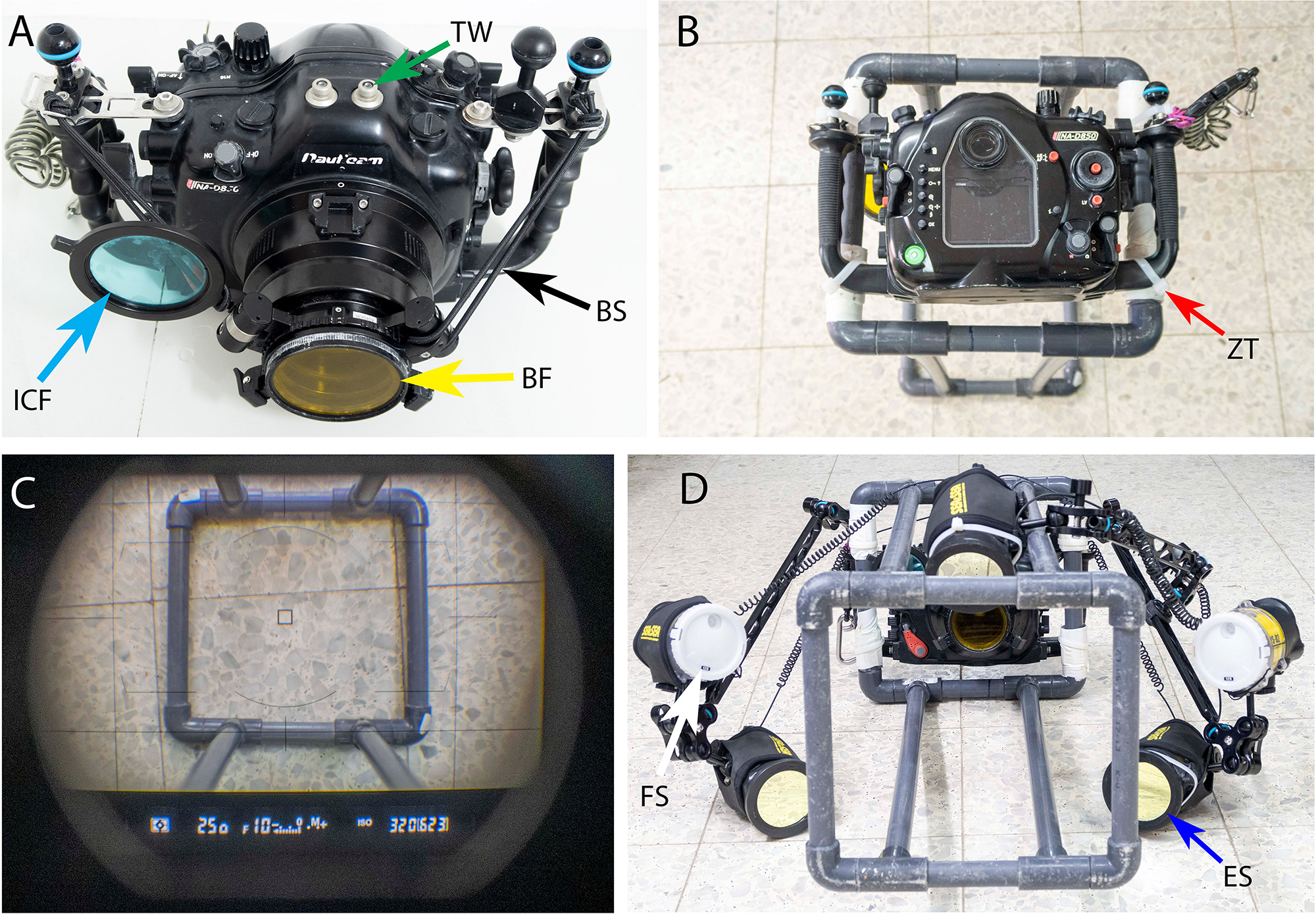 (A) The Nauticam NAD850 camera housing with Nauticam double filter holder for a Barrier Filter (BF-yellow arrow) and Infrared Cut Filter (ICF-blue arrow). See the Bungee Straps (BS-black arrow) added to the setup that helps to retract the filter from the port in one finger touch and the Trigger Window (TW-green arrow) on the upper side of the housing. (B) The housing is mounted on the quadrat frame with Zip-Ties (ZT-red arrow). (C) A look via the camera viewfinder to verify if the camera is centered with the quadrat and the shooting parameters are correct. (D) The speed-FluorIS is mounted and ready to use with five strobes, 3 Excitation Strobes (ES-blue arrow) and 2 Full Spectrum (FS-white arrow) strobes.