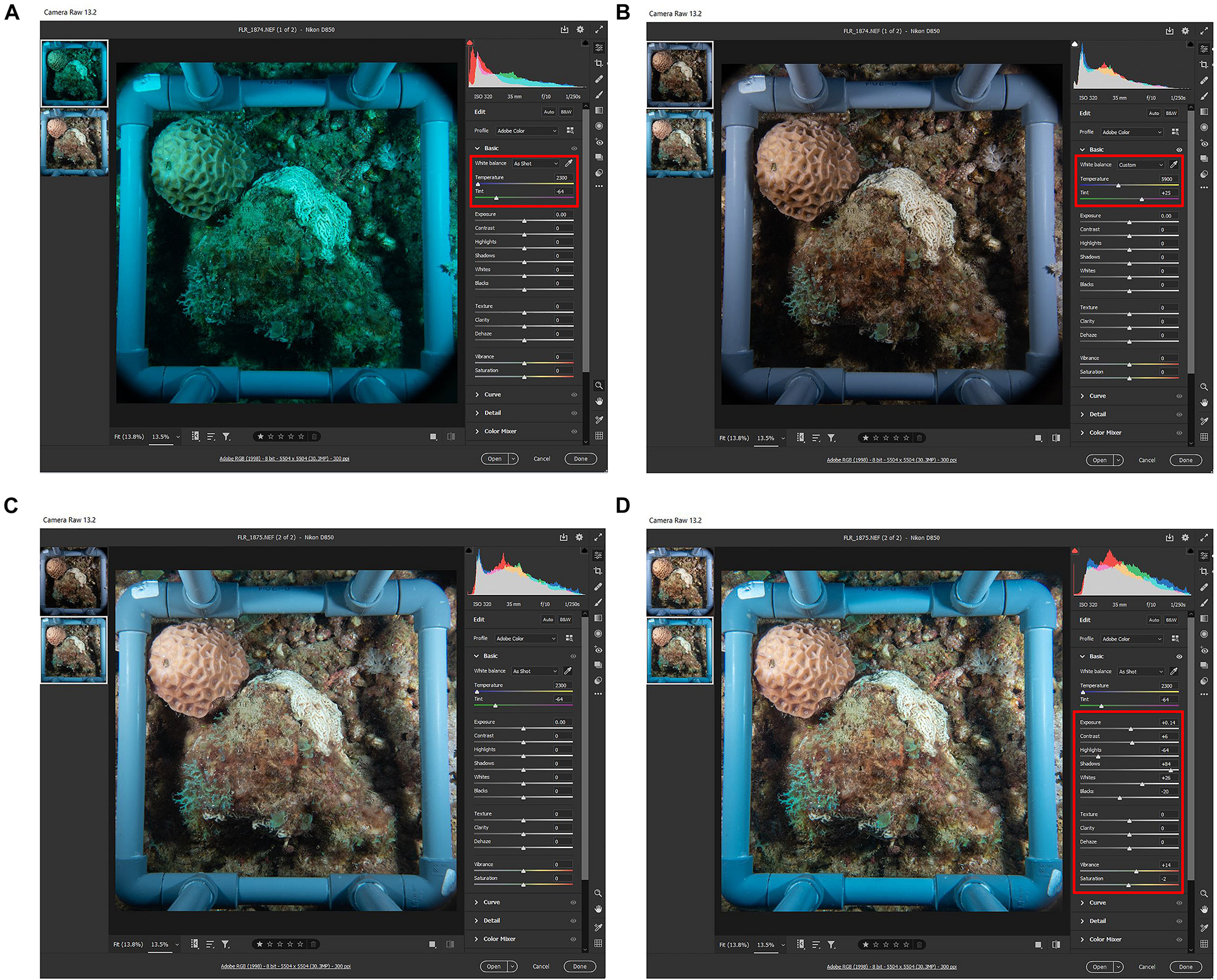 Demonstrating the irrelevance of the Infrared Cut Filter. (A) Raw image taken with ICF on the camera port. (B) The same image from A after white balance (WB) correction in post processing using adobe camera raw (Adobe, United States). (C) Raw image taken without ICF shows the correct colors without the need of WB correction. (D) The same image from C after automatic editing tool using adobe camera raw (Adobe, United States). Red box indicates the command setting.