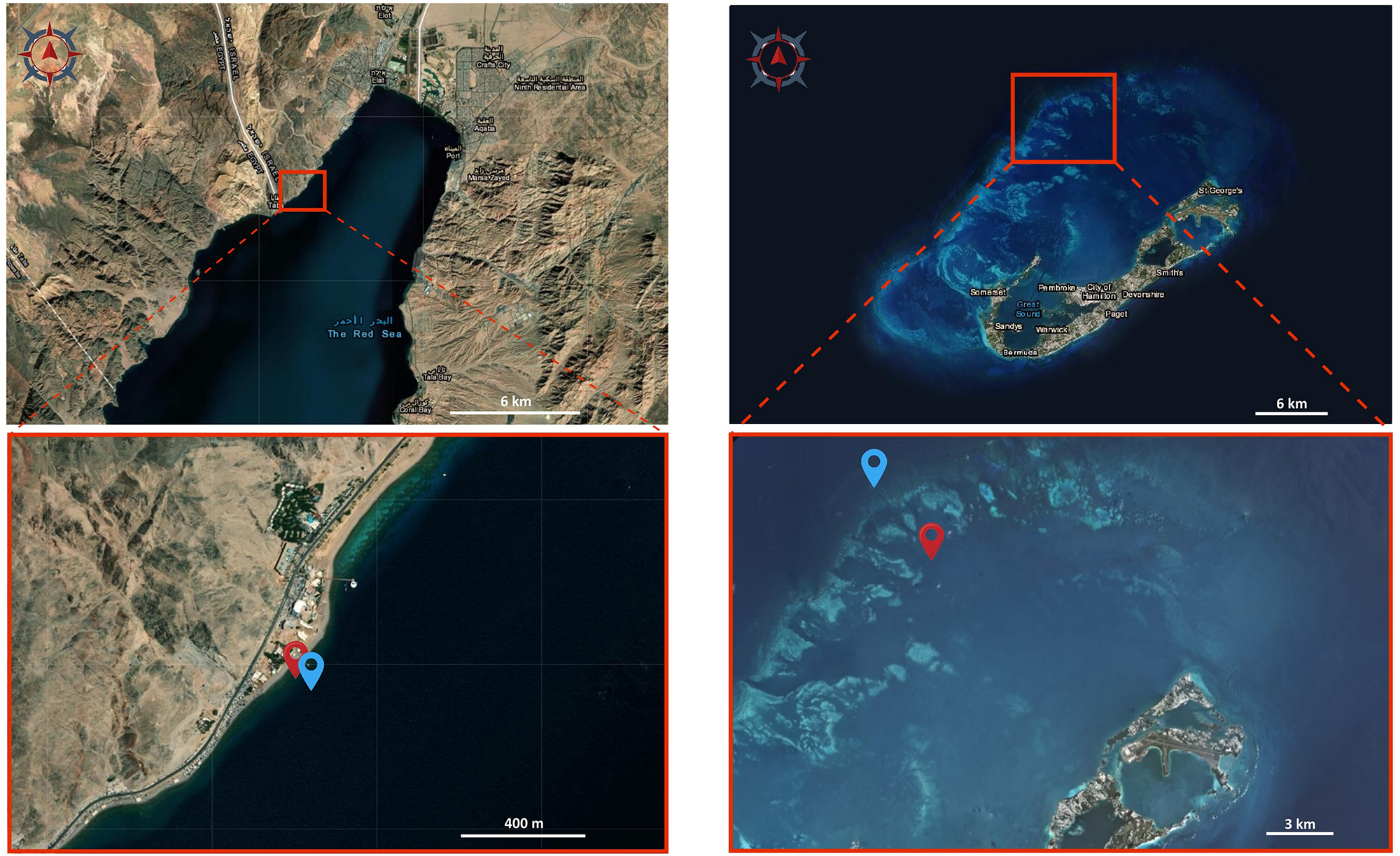 Satellite images of the study sites. Images of Eilat (left) and Bermuda (right) showing the sampling locations. Red locators in the bottom images indicate the shallow reefs, blue locators indicate the mesophotic reefs. Image source: Earthexplorer.usgs.gov.