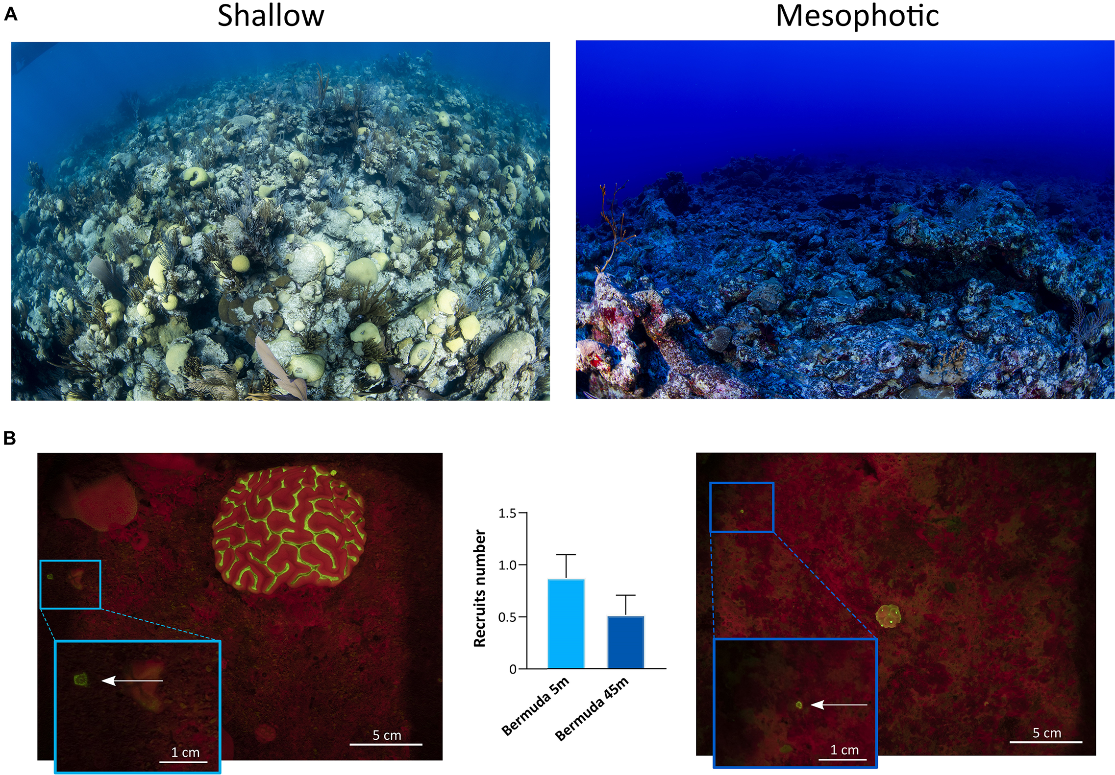 Shallow and mesophotic reefs in Bermuda and detection of coral recruits. (A) Images of the sampling sites at the shallow (left) and mesophotic (right) reefs in Bermuda. (B) Fluorescence images of the quadrat deployed in the shallow (left) and mesophotic (right) reefs of Bermuda. The arrows within the insets point to coral recruits. The central graph shows the number of recruits identified in the shallow (n = 17 quadrats) and mesophotic (n = 21 quadrats) reefs of Bermuda. Values are shown as means ± SEM.