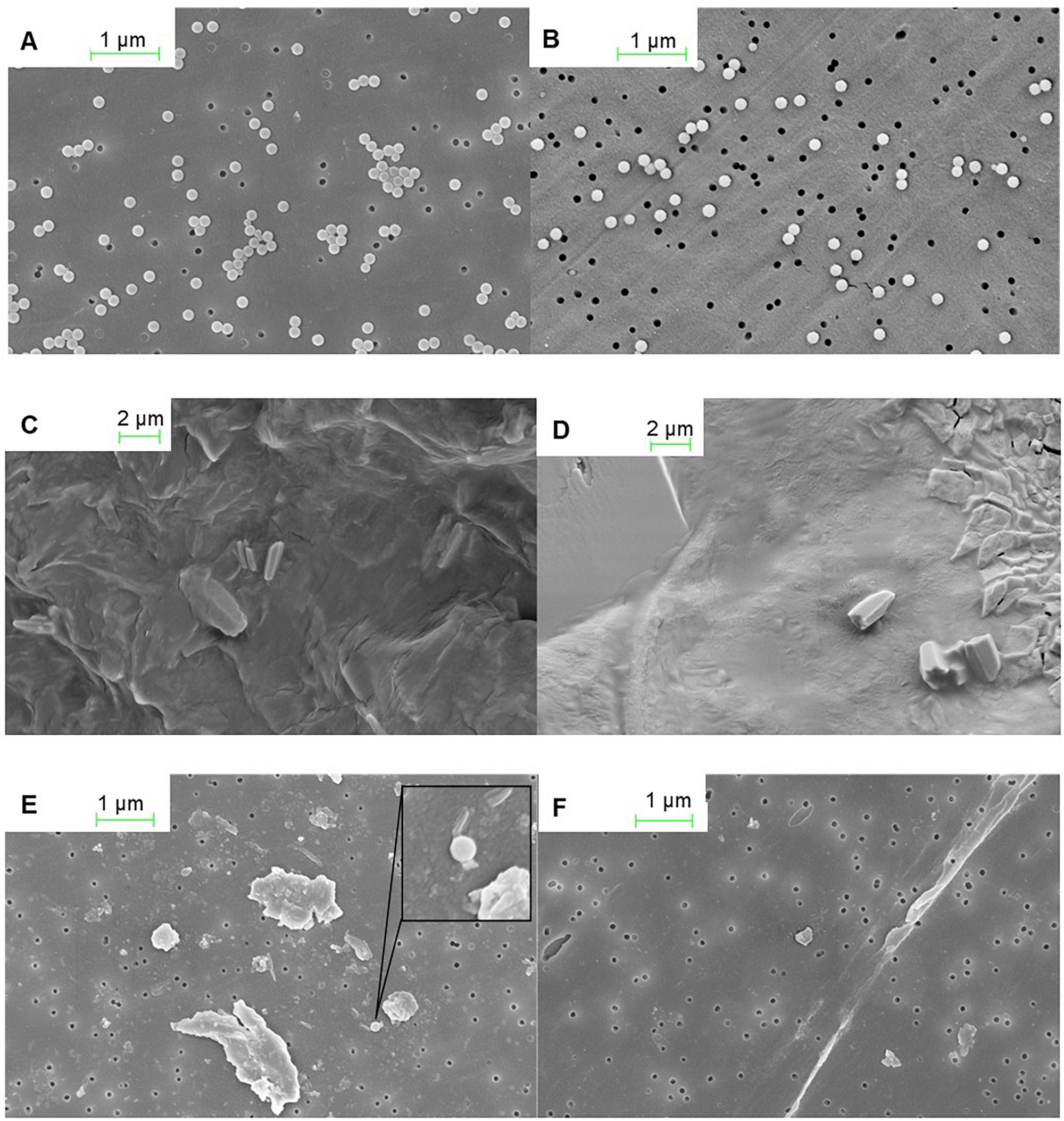 SEM images from nanoplastic investigations of the krill chorion and residual of digested krill embryos. (A) Nanoplastic stock diluted with Milli-Q on a polycarbonate membrane. (B) Nanoplastic stock diluted with Milli-Q on polycarbonate membrane post treatment with10% KOH (60°C, 48 h) to mimic the krill egg digestion. (C) Chorion of a krill embryo from the control treatment. (D) Chorion of a krill embryo from the plastic treatment. (E) Digested (10% KOH, 60°C, 48 h) krill egg residual on a polycarbonate membrane of embryos Milli-Q cleansed. (F) Digested (10% KOH, 60°C, 48 h) krill egg residual on polycarbonate membrane of embryos Milli-Q and ethanol cleansed. SEM images are courtesy of Christian Hacker, University of Exeter.