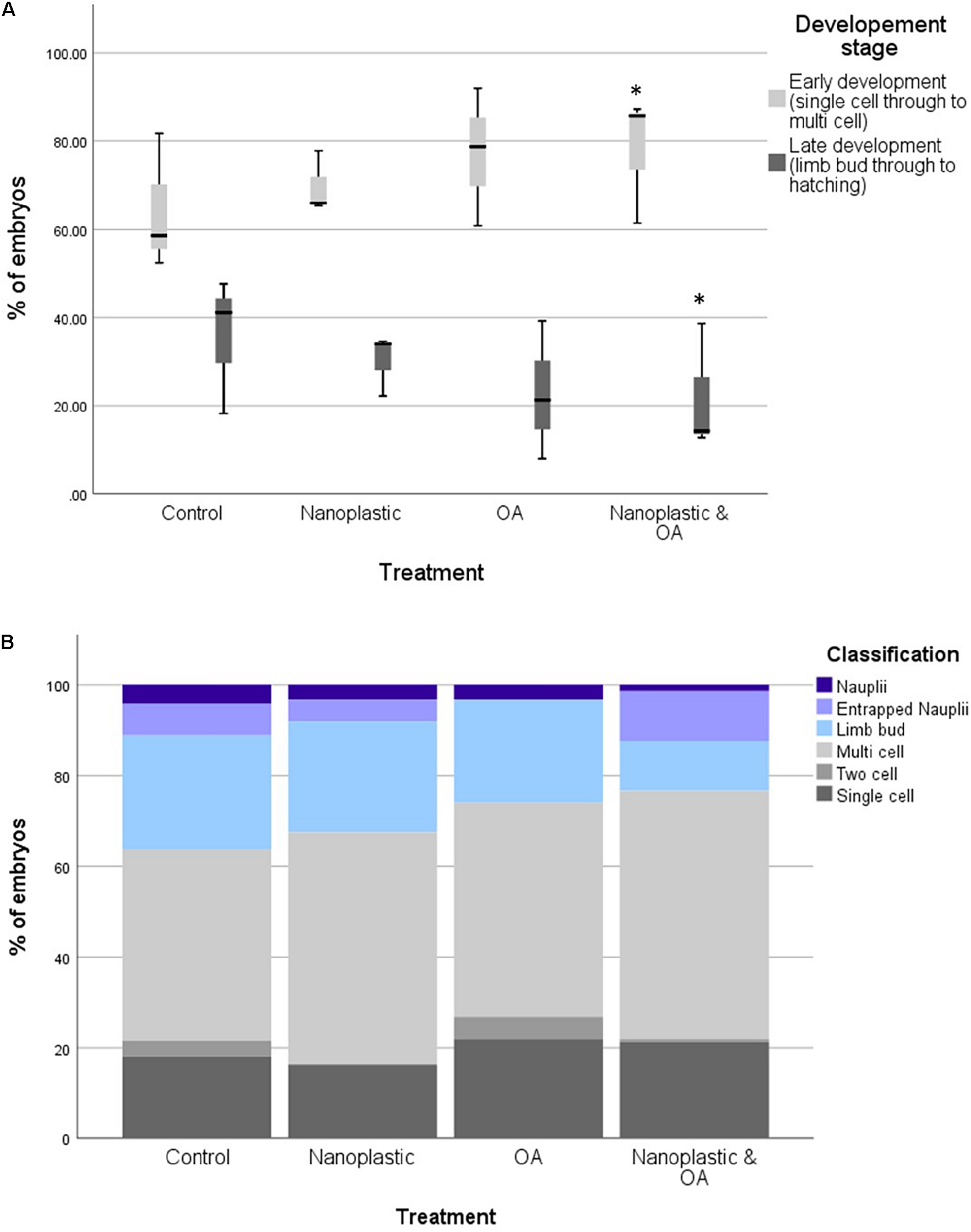 Statistical analyses were conducted in R Studio version 1.4.1103. A binomial regression was used to determine the probability of embryos reaching the limb bud or later stage differing between treatments with assumptions met, i.e., no multicollinearity, linearity in the logit reported and independent error terms. The optimal model was backwards selected from the full model, which contained a three-way interaction between all measured explanatory variables [i.e., treatment (control, nanoplastic, ocean acidification, nanoplastic, and ocean acidification), individual well (to account for variance between replicates), and number of embryos per well (to account for the variance in the number of embryos that were randomly pipetted into each well plate)]. We also included two-way interaction terms for the measured explanatory variables, primarily to determine whether any relationship existed between treatment and the number of embryos per well that may have influenced the probability output of embryos reaching the limb bud or later stage. Additionally, we ran the model with a random downsized equal sample (n = 100 per treatment) which yielded the same results in terms of the significant or non-significant effects, and consequently we present the model utilising all available data.