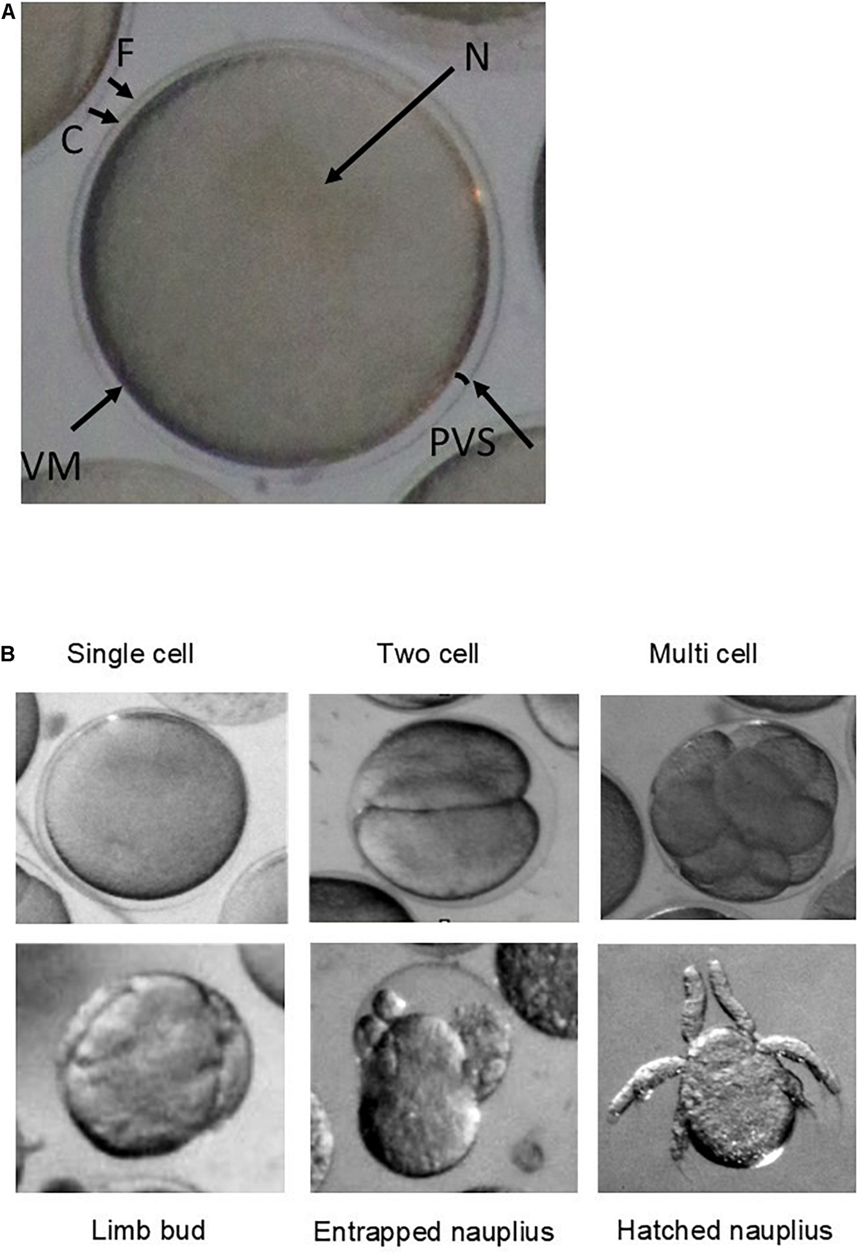 (A) Microscope image (Olympus SZX16 stereomicroscope with a Canon camera appended via a 0.5 magnification lens adaptor) of a newly spawned krill egg from outer to inner embryo: (F) fertilisation jelly, (C) chorion (egg membrane), (PVS) perivitelline space, (VM) vitelline membrane, and (N) nucleus. (B) Microscope images (Olympus SZX16 stereomicroscope with a Canon camera appended via a 0.5 magnification lens adaptor) of each development stage categorised as: single cell, two cell, multiple cell, limb bud, entrapped nauplius, and nauplius.