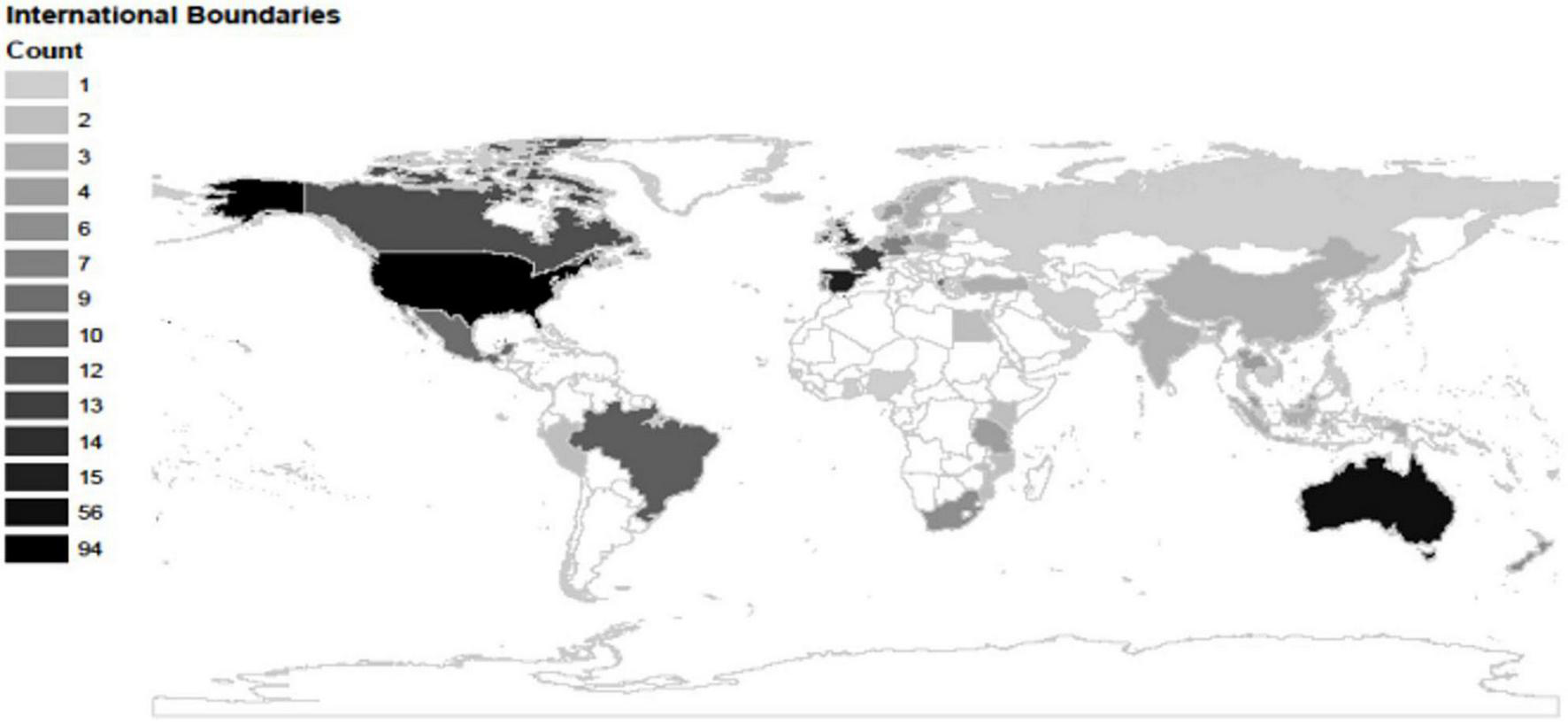 The review found ocean perceptions research conducted on populations in Europe (31%), North America (27%), Oceania (17%), Asia (11%), Africa (6%), South America (4%), Caribbean (3%), and Central America (2%; Figure 2). The United States and Australia were the countries with the most studies with 24% (94) and 14% (56) studies, respectively. All other countries had 15 or fewer studies, with 57 countries having fewer than five studies (Figure 2; Supplementary Table 4). In terms of scale, the majority of studies (84%) assessed public perceptions at a sub-national scale (e.g., Piriyapada and Wang, 2014), with 12% at the national scale (e.g., Goldberg et al., 2016), and only 5% assessed perceptions in more than one country. The largest study assessed ocean perceptions in ten countries (Gelcich et al., 2014).