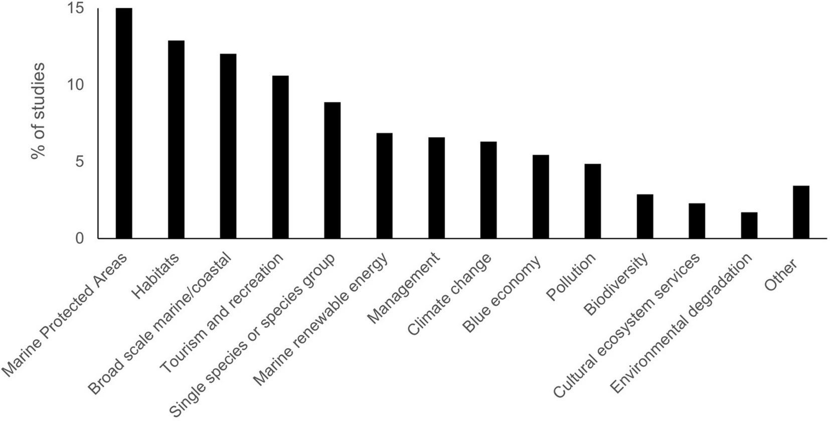 The most studied ocean topic was perceptions related to MPAs (15% of all studies; Figure 3) including for example, reactions of local communities to a no-take MPA in South Africa (Faasen and Watts, 2007), exploration of international tourists’ willingness to pay to visit marine parks in the Seychelles (Mwebaze and MacLeod, 2013) and comparisons between public and expert views of threats to the ocean and proportion of New Zealand waters which are currently and should ideally be protected (Eddy, 2014). Studies exploring perceptions of biota included habitats (13%), single species or species groups (9%) and marine biodiversity (3%). Blue economy studies were dominated by research on perceptions of marine renewables, so this was split into two categories: blue economy (5%) including fisheries, aquaculture, desalination and mining; and marine renewables (7%). Threats explored through the studies include climate change (6%), pollution (5%), and environmental degradation (2%). 12% of studies explored perceptions of the marine environment or the coast without linking to a particular location or issue, categorized as broad scale marine and coastal. For example Chen and Tsai (2016) investigated ocean environmental awareness in Taiwanese students and Pakalniete et al. (2017) explored the preferences of Latvian citizens for improved marine waters.