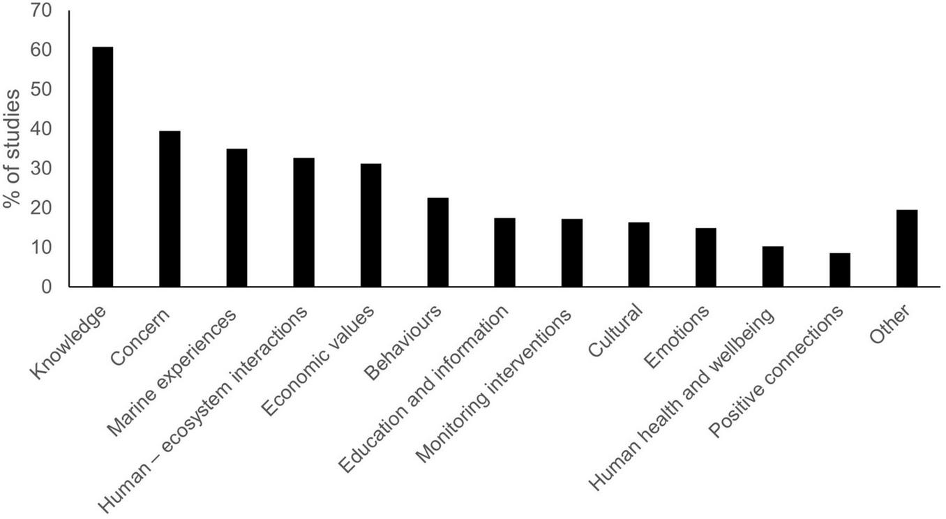 Behavior change is at the heart of conservation (Schultz, 2011), with behavioral sciences such as environmental psychology exploring the complex process of catalyzing behavior changes. Behavior change is influenced by internal factors, such as an individual’s emotions and values, and external factors such as the prevailing culture and social norms (Kollmuss and Agyeman, 2002). The idea that “people care about what they know” (Balmford et al., 2002) is persuasive, yet raising awareness or knowledge of marine conservation issues on its own rarely results in a behavior change (Stoll-Kleemann, 2019). Yet almost two-thirds of ocean perceptions research studies measured respondent knowledge (Figure 4). This suggests an underappreciation of factors such as emotions, culture, positive connections, or behaviors themselves in ocean perceptions research (Jefferson et al., 2015; McKinley and Burdon, 2020).
