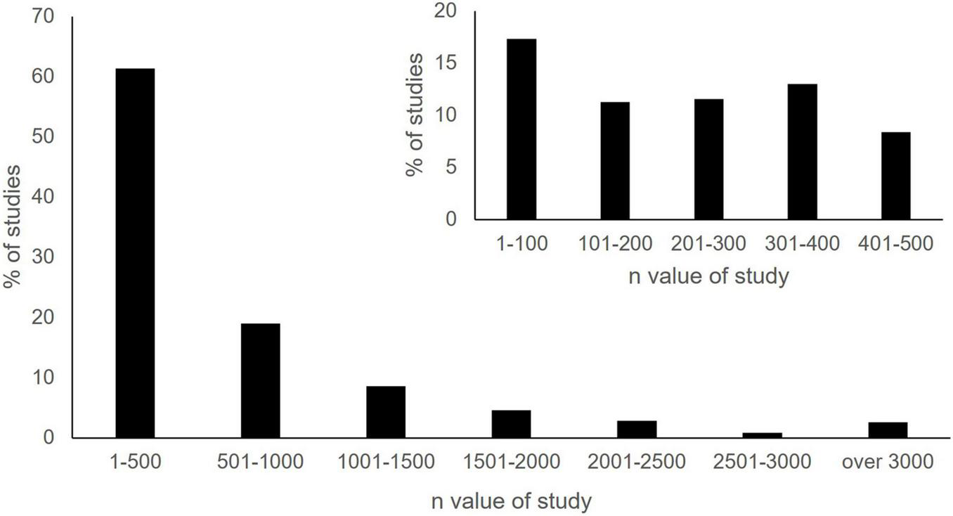 Figure 5. Percent of ocean perceptions studies within each sample size category. Inset presents sample sizes for studies with fewer than 500 respondents (n = 347).