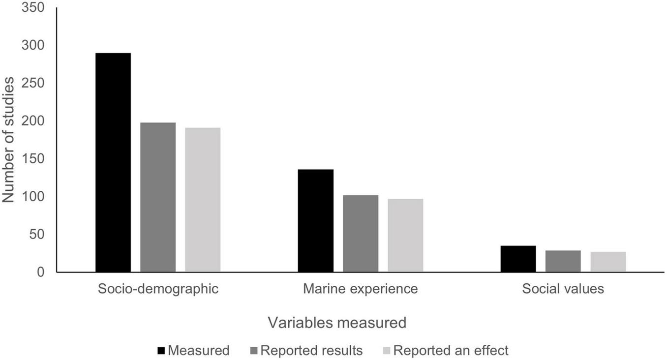 Figure 6. Number of ocean perceptions studies which measured, reported results, and reported effects of socio-demographic variables, ocean experience and social values (n = 349).