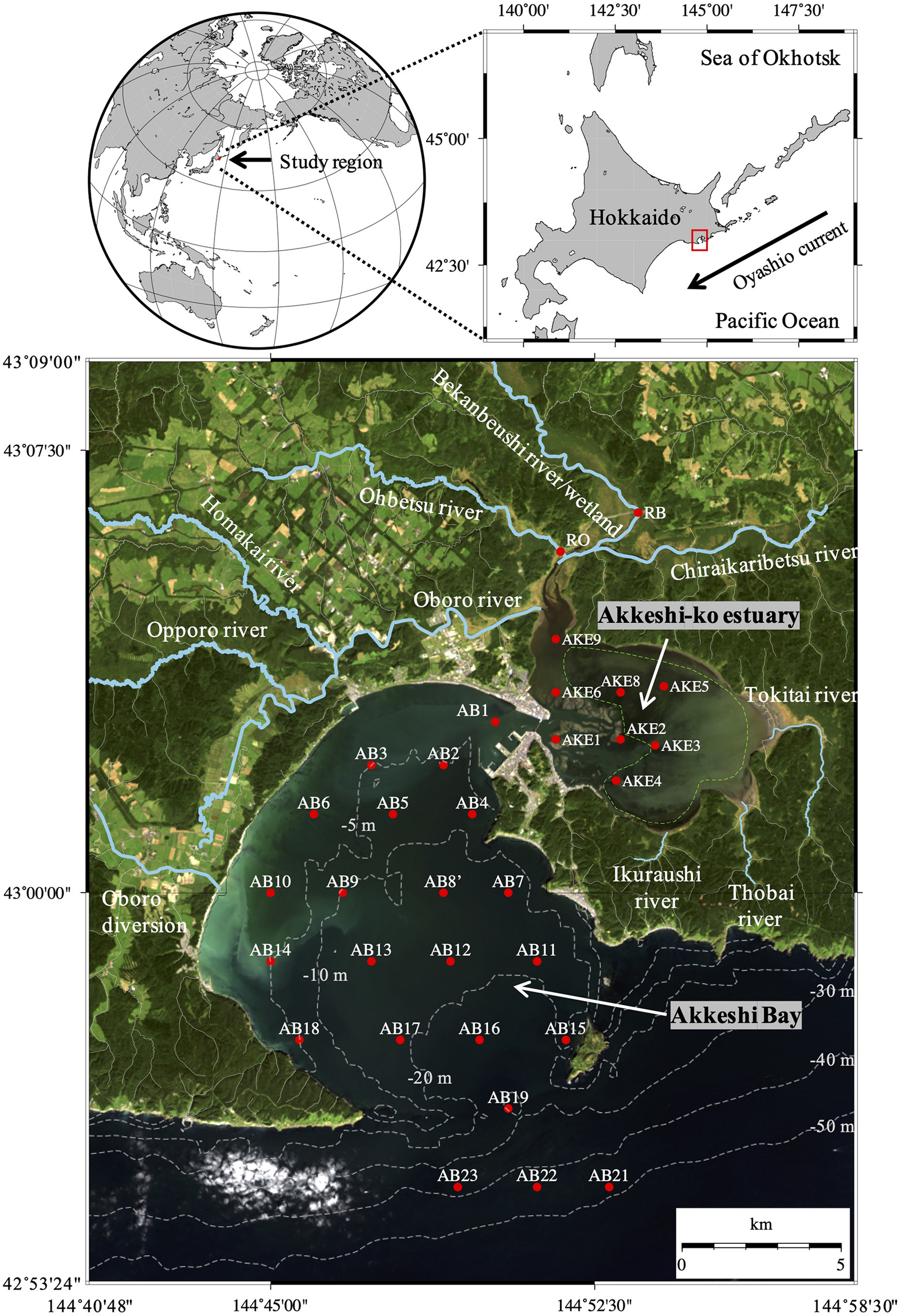 Sampling stations in the rivers (RO and RB), Akkeshi-ko estuary (AKE), and Akkeshi Bay (AB) superimposed on a quasi-true color image derived from Landsat 8 (USGS/NASA) on September 22, 2014. Area enclosed by the green dashed line in AKE represents the eelgrass (Zostera marina) meadow after Hasegawa et al. (2008).
