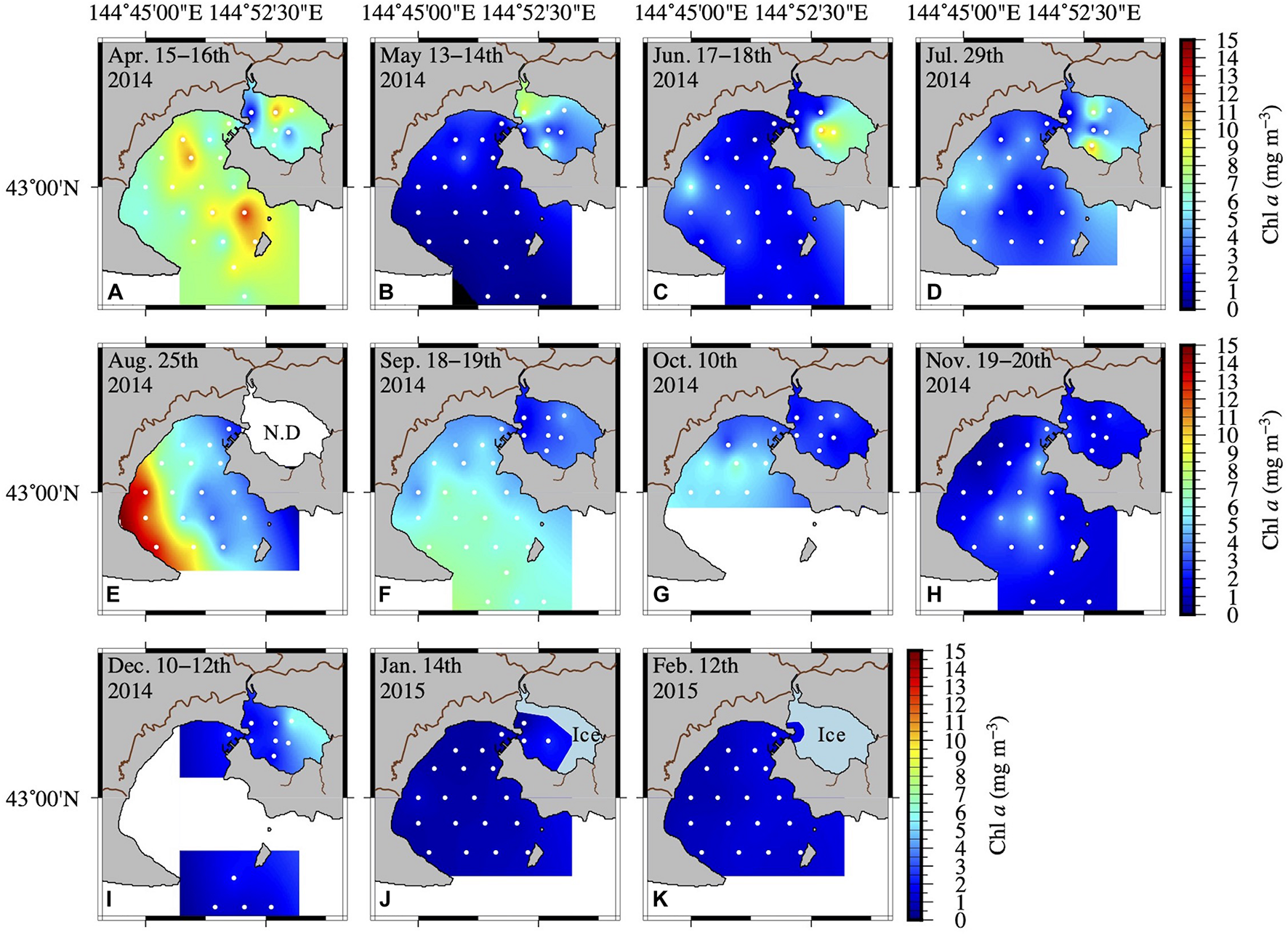 Spatial distribution of Chl a concentration at the surface (A–K) from April 2014 to February 2015. Inter- and extrapolation of the data were implemented by the General Mapping Tools. White symbols in each figure represent the sampling sites.