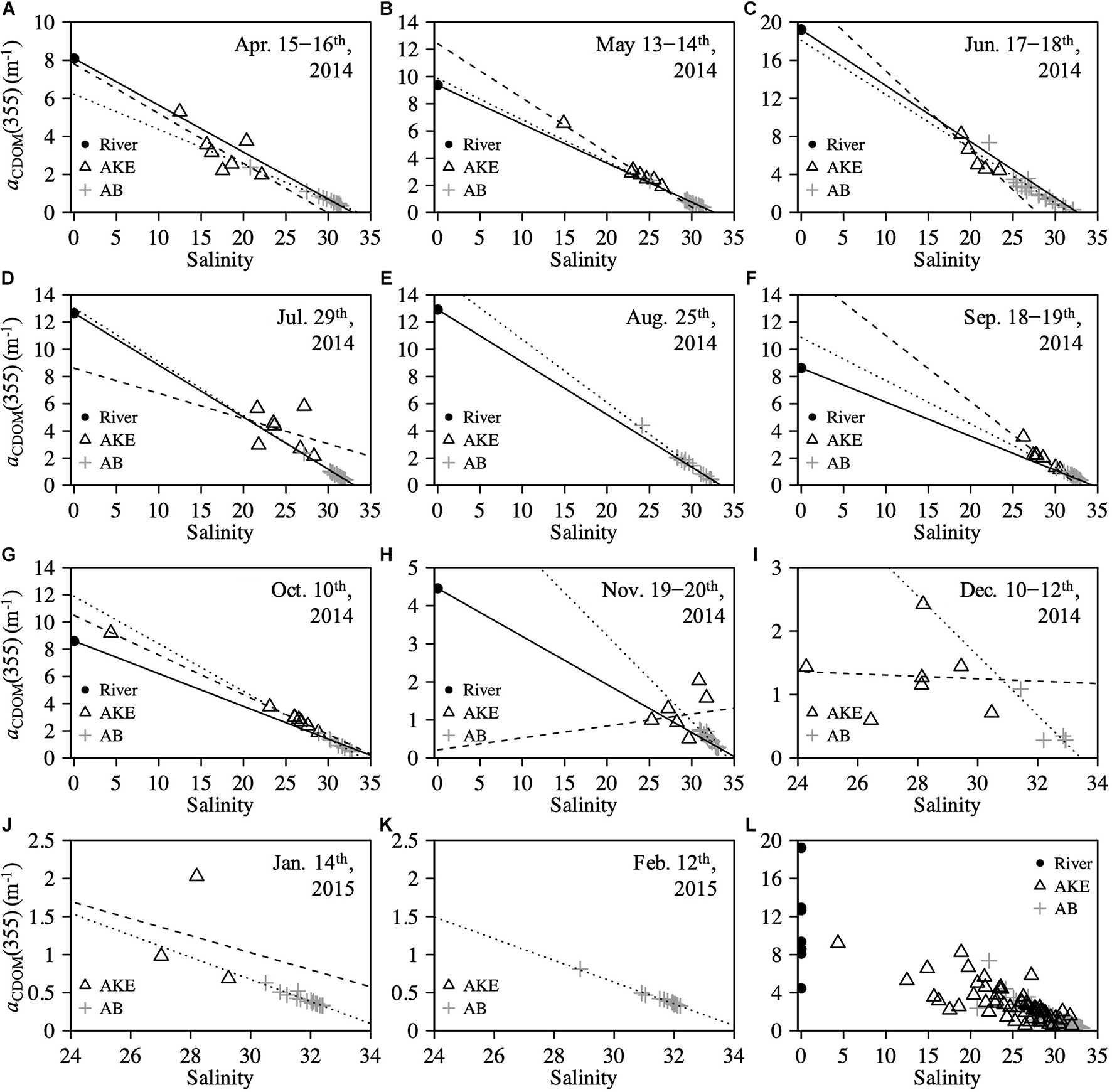 Relationships between salinity and aCDOM(355) at the surface (A–K) from April 2014 to February 2015 and (L) throughout the study period. Solid line in each figure represents the conservative mixing line of two-end-members between freshwater (RB) and coastal water based on salinity. Sample taken in RO was used as the freshwater end-member in (E) August 2014. Dashed and dotted lines represent the regression lines estimated from AKE and AB samples, respectively.