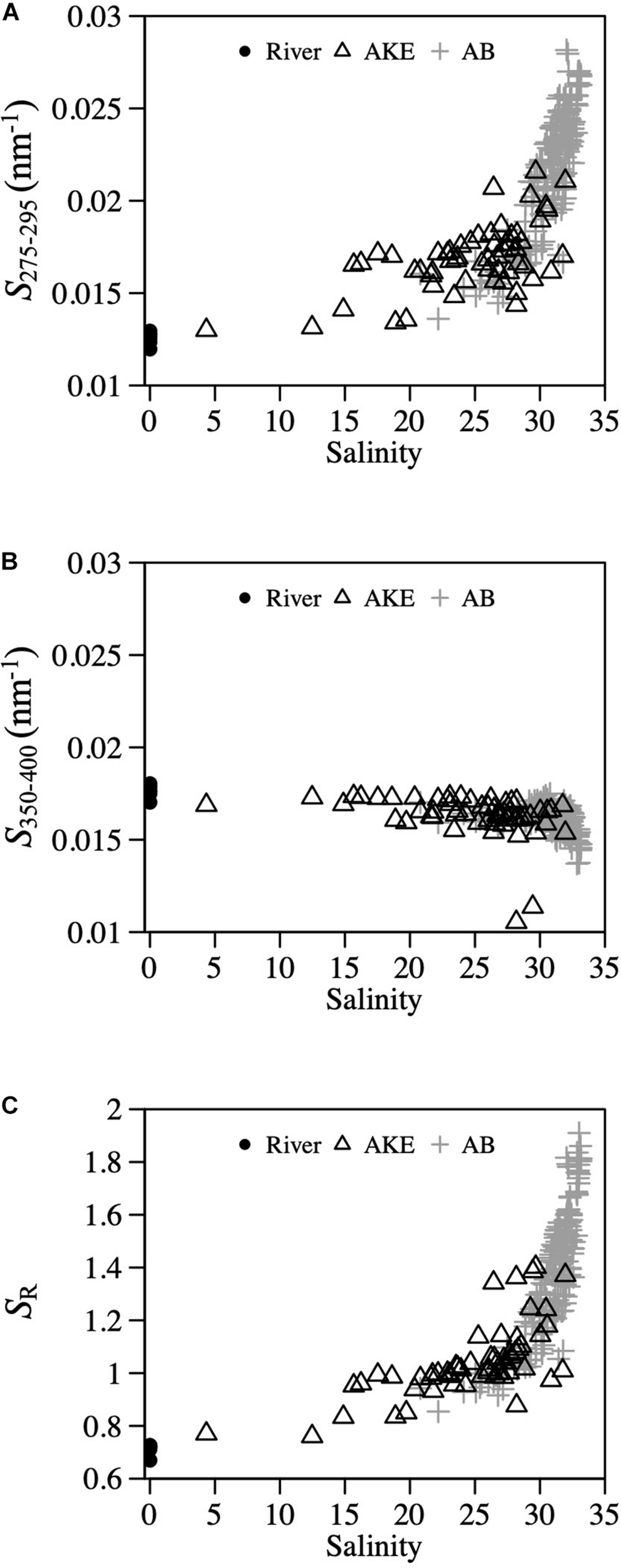 The absorption coefficient of CDOM at 355 nm [aCDOM(355)] in surface waters showed large spatial gradients from freshwater to coastal waters (Figure 5). The values of aCDOM(355) were highest in RB and RO, ranging from 4.454 to 19.210 m–1. These values decreased to 0.510–8.249 m–1 in AKE and to 0.258–7.350 m–1 in AB. Comparisons of the regression lines between salinity and aCDOM(355) in AKE and AB samples with the mixing lines predicted by two end-members between freshwater and coastal water indicated conservative mixing in aCDOM(355) with salinity from CDOM-rich wetland water to the coastal waters in AB during each month (Table 2 and Figure 5). In contrast, the regression lines in AKE indicated non-conservative mixing in CDOM with salinity. Although the slope and y-intercept of the regression line for AKE samples in April 2014 was about the same values calculated by the mixing line predicted by two end-members, the coefficient of determination (R2) was low in comparison to the regression line for AB samples (Table 2). The spectral slope coefficient (S275–295) in the river was lower than that at the AKE and AB sampling stations. The values of S275–295 ranged from 0.0114 to 0.0282 nm–1 and showed an exponential dependence on salinity (Figure 6A). In contrast, S350–400, which ranged from 0.0105 to 0.0182 nm–1, showed a lack of dependence on salinity (Figure 6B). As a result, SR increased with increasing salinity along the freshwater–estuary–coastal ocean continuum (Figure 6C). However, samples collected from AKE lay outside of the exponential mixing line from river to marine samples.