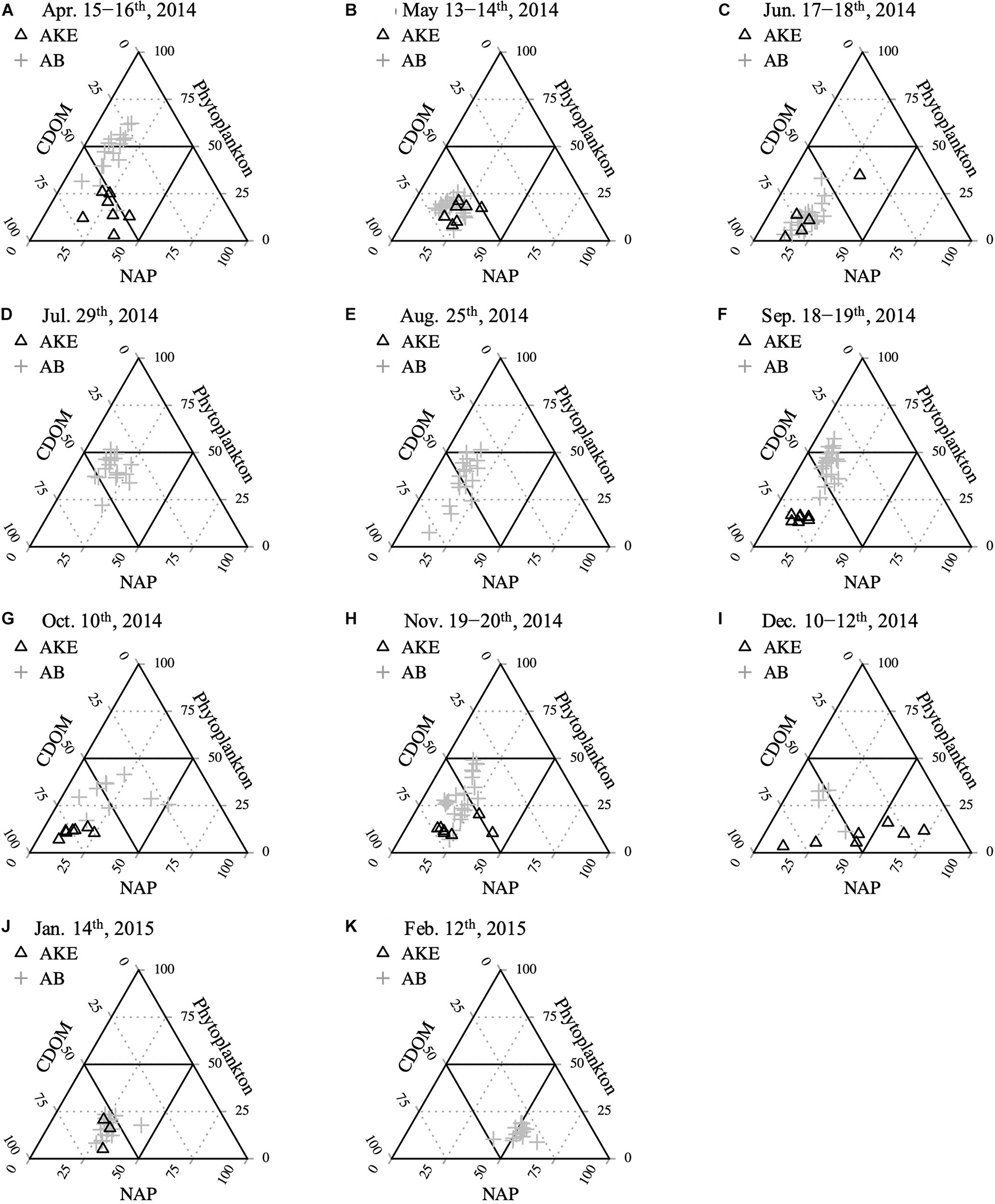 The Chl a concentration in AKE and AB showed more than a 40-fold variation across all seasons. Spring phytoplankton blooms with higher Chl a concentrations were found in AB in April 2014 (Table 1 and Figure 4A). Subsequently, Chl a concentrations at the surface were low in AB. Spatially heterogeneous Chl a concentrations were found in AKE from April to July 2014 and in AB in August 2014 (Figures 4A–E). Although Chl a concentrations in AKE were significantly higher than those in AB in May 2014 (Wilcoxon rank sum test; p < 0.001), the opposite trend was observed from September to October 2014 (Wilcoxon rank sum test; September: p < 0.001; October: p < 0.01) (Figures 4F,G). In other seasons, no significant difference in Chl a concentration between AKE and AB was found (Figures 4A,C,D,H–K). Secchi disk depths (ZSD) in AB showed a 10-fold variation across all seasons. Higher values of ZSD were observed in November and December 2014, whereas lower values of ZSD were observed in February 2015 (Table 1).