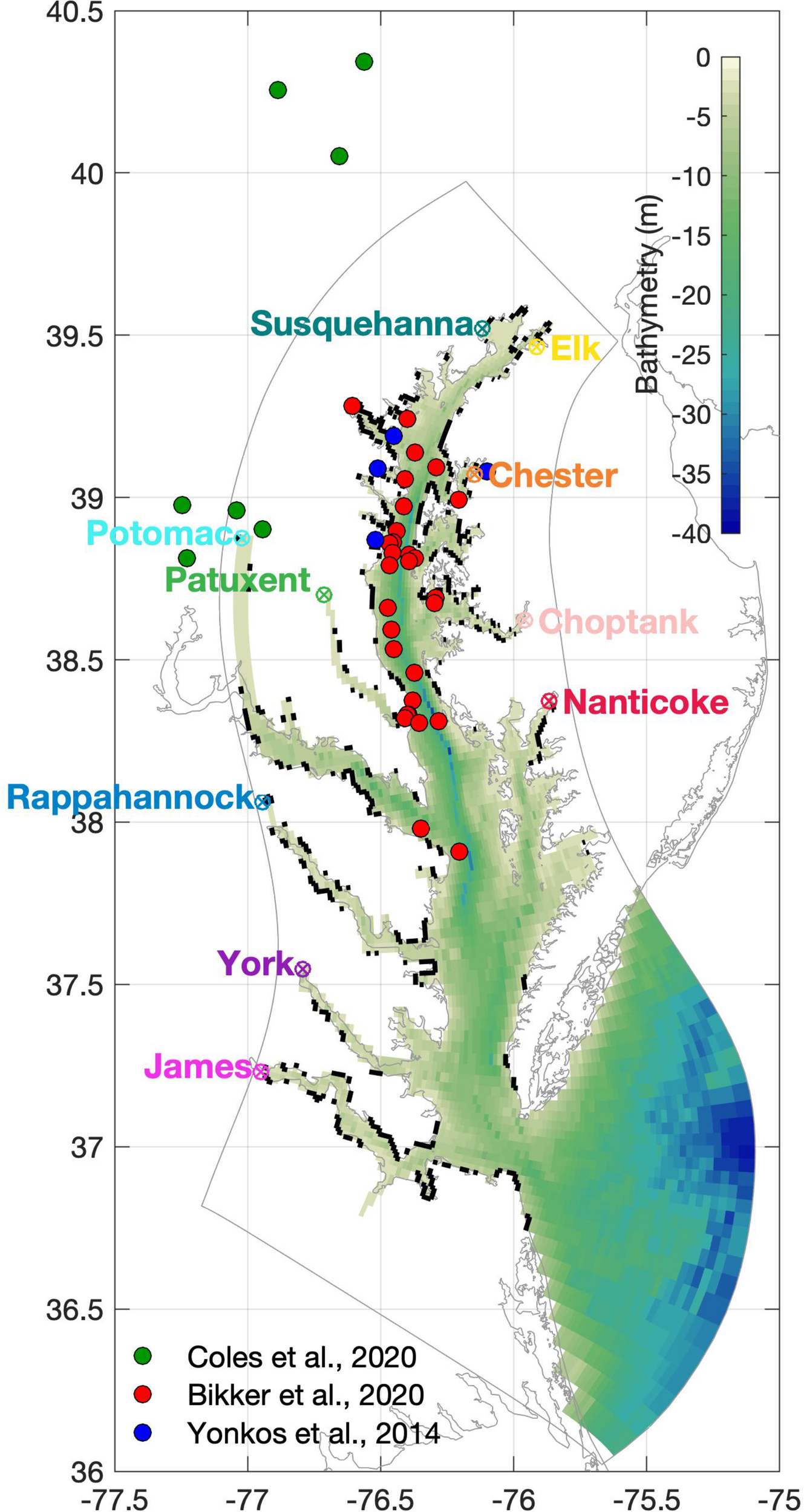 Here we use a model of estuarine microplastic transport to test the hypothesis that a large estuary, the Chesapeake Bay, is a potentially large filter, or “sink,” of riverine microplastics. Numerical modeling has been an essential tool for understanding microplastic distributions in the open ocean environment. However, in contrast to the plethora of microplastics modeling studies in this environment (Eriksen et al., 2014; Hardesty et al., 2017; Sterl et al., 2020), such studies are rare in estuarine and coastal waters, despite the benefit they provide by informing monitoring and sampling efforts as well as the development of budgets. Even within this small group of studies, primary differences exist in particle density, the presence of beaching, the input location of particles, and simulation length. Beaching, when included, was found to have a large impact on microplastics fate in numerous modeling studies, including those of Jervis Bay, Australia (Jalón-Rojas et al., 2019); San Francisco Bay, United States (Sutton et al., 2019); the East China, Yellow, and Bohai Seas (Zhang et al., 2020); the Mediterranean Sea (Liubartseva et al., 2018); and a small (104 km2) coastal region of eastern Australia (Critchell and Lambrechts, 2016). Modeling suggests that the estuarine circulation itself can also trap microplastics (Díez-Minguito et al., 2020), much in the way the estuarine turbidity maximum forms. Two studies identified particle density to be an important factor in distribution and fate (Jalón-Rojas et al., 2019; Sutton et al., 2019). Numerous studies are idealized in terms of the input location of particles (Critchell and Lambrechts, 2016; Iwasaki et al., 2017; Cohen et al., 2019; Genc et al., 2020), but several include sources emanating from rivers and estuaries (Liubartseva et al., 2018; Sutton et al., 2019; Zhang et al., 2020). Simulation lengths vary dramatically, from several days (Critchell and Lambrechts, 2016) to a decade (Iwasaki et al., 2017). Overall, beaching and particle density stand out as notable factors in influencing the fate of microplastics. However, notable among all of these studies is the general lack of simulations of the fate of riverine plastics in estuaries, including beaching, with the study of Sutton et al. (2019) being the main exception.