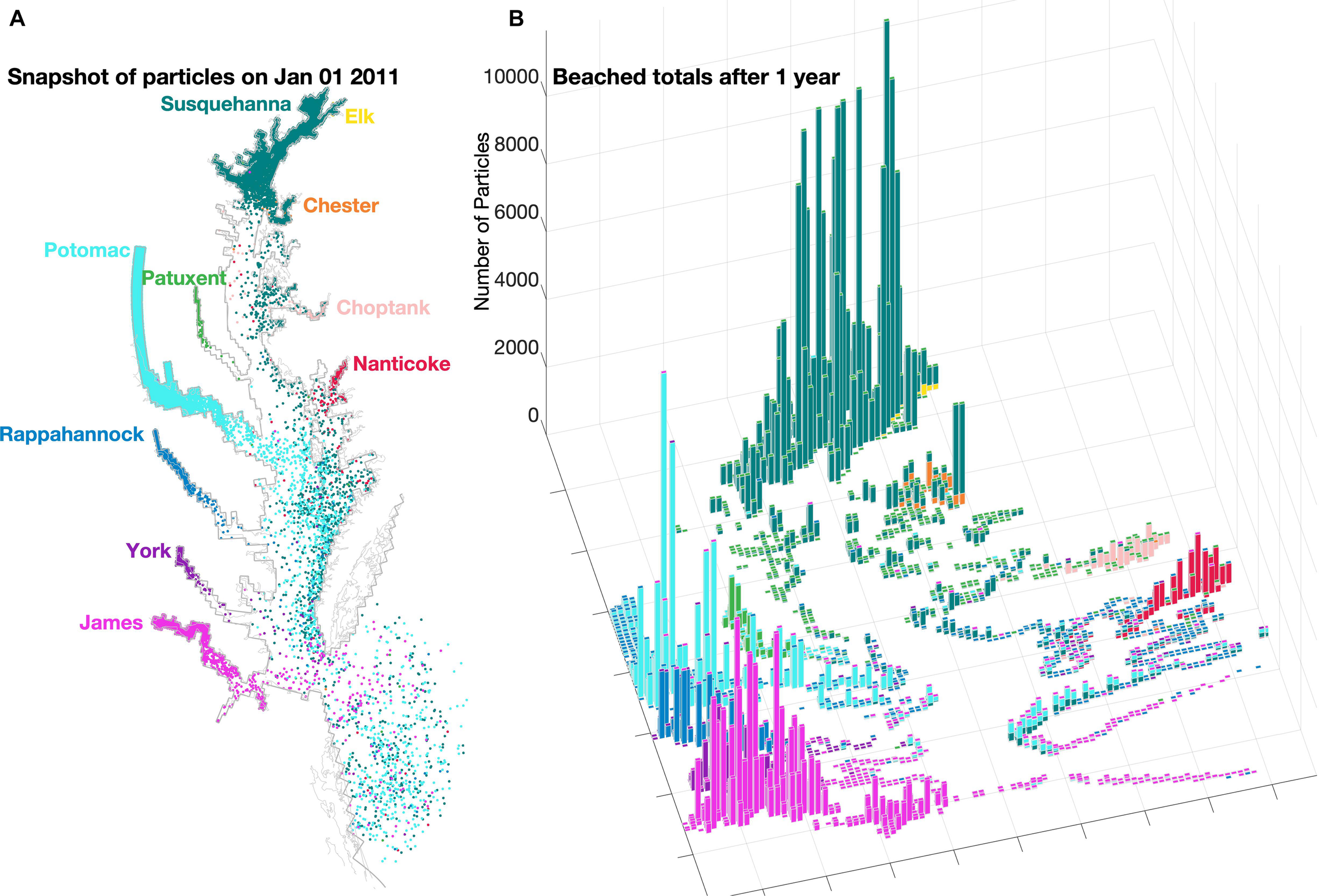 In our simulations, the vast majority of riverine microplastics entering the Bay tend to beach and do so within their tributaries before reaching the mainstem of the Bay; thus greater attention should be paid to tributary coastlines when planning sampling efforts, similar to the model findings Schernewski et al. (2020) of high accumulation rates along Baltic Sea shorelines near source locations. Another potential hotspot of accumulation appears to be the eastern shore of the Bay, which is supported by earlier particle tracking simulations and observations of phytoplankton, zooplankton, and Bay anchovy eggs and larvae that show accumulation is due to low flushing rates and convergence (Hood et al., 1999).