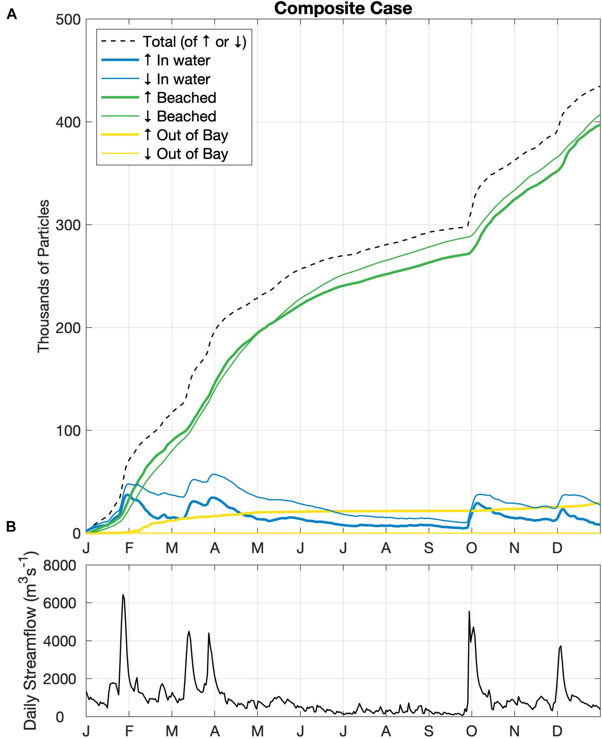The strong seasonality seen in both floating and sinking particles in the water column, notably larger percentages from October through May compared to June through September, corresponds to streamflow. After each of the five prominent streamflow peaks throughout 2010 (Figure 4B), water column inventories increase, reflecting the increase in particle load from the rivers. These inventories then decline over the following weeks as particles are beached. The beached inventories always increase as a result of the one-way transport from water column to shoreline (as the model does not resuspend beached particles), but the rate of increase is always greatest following a streamflow peak. Most notable is the large peak in early fall, which occurred after a long period of low flow during the summer.