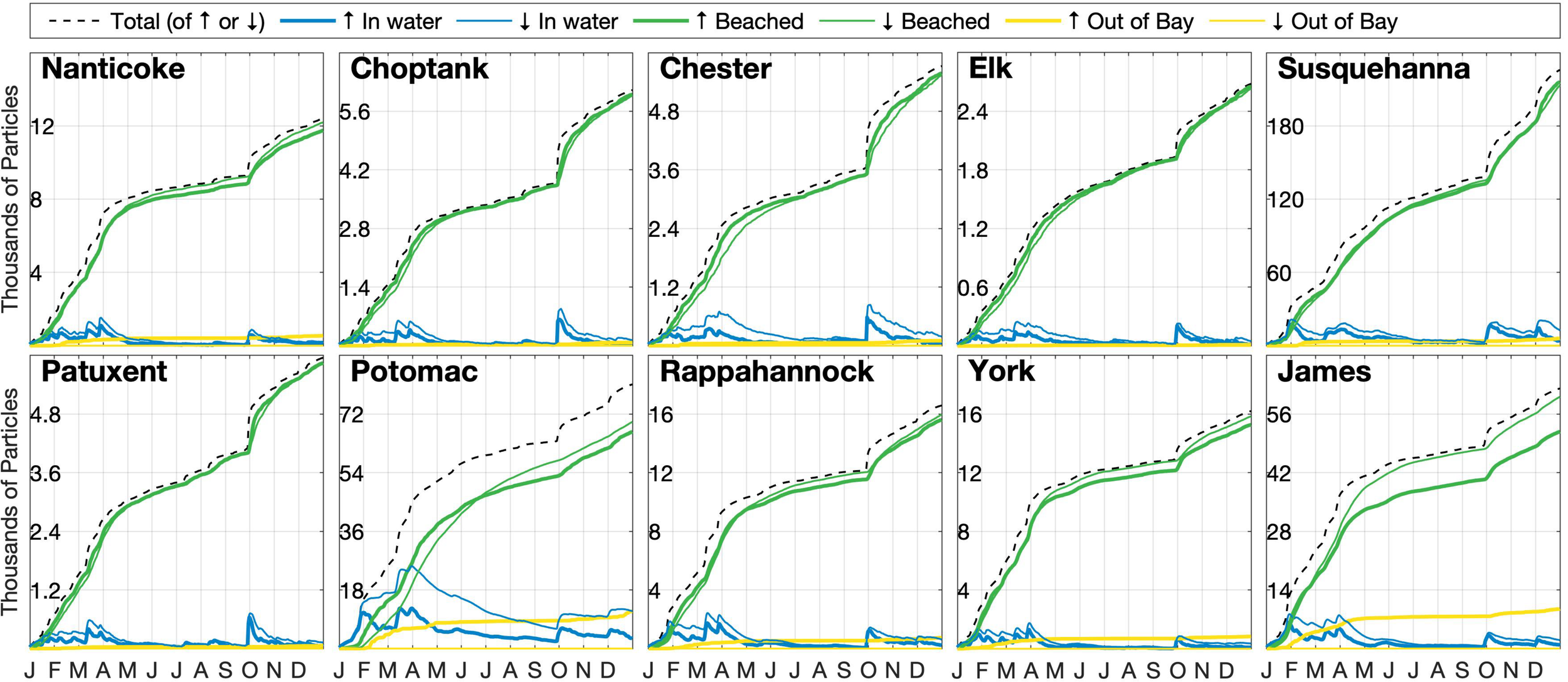 The composite simulation time series of the individual inventories of particles (in water inside the Bay beached inside the Bay, or out of Bay) and their total by their river source location. Line thickness indicates whether the particles are less dense than seawater (thick) or denser than seawater (thin). The black line represents the sum of either all of the floating (↑) or sinking (↓) particles with time, as equal amounts were added throughout the simulation. Note difference in vertical scales.