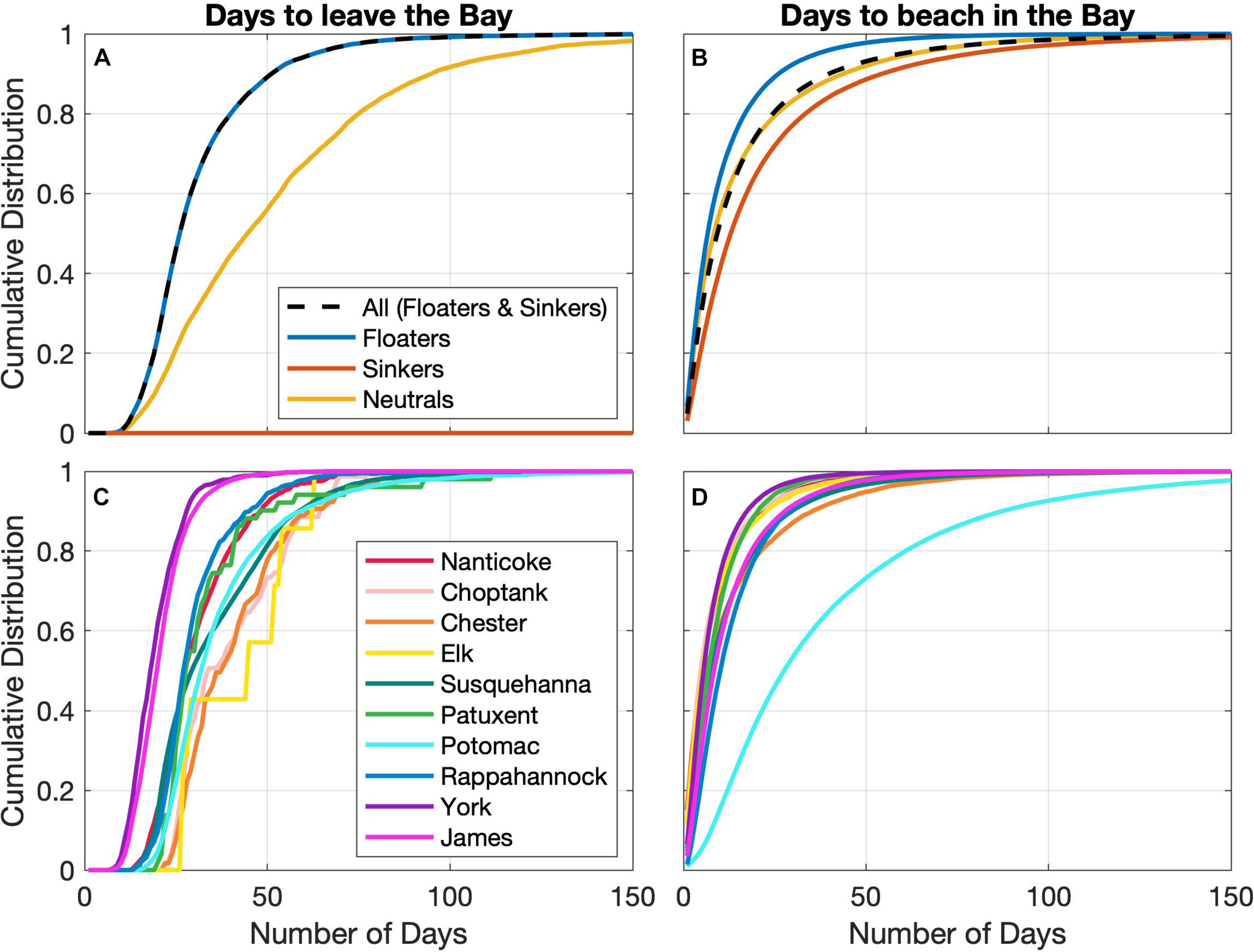 The length of time from when a simulated (floating or sinking) particle entered the model domain (via rivers) to when the particle was removed, either by exiting the Bay or by being deposited along the shoreline, is visualized with cumulative distribution functions (Figure 6). We can see Figure 6A that, as no sinking particles leave the Bay, the “All” curve aligns with the “floaters” curve. Half of all floaters that leave the Bay do so in 26 days. Figure 6B shows that sinking particles spend more time in the water column than floating particles do before eventually beaching, while neutrally buoyant particles nearly align with the mean timing of all floating and sinking particles. For example, half of particles beach within 7, 9, and 13 days for floaters, neutrals, and sinkers, respectively.